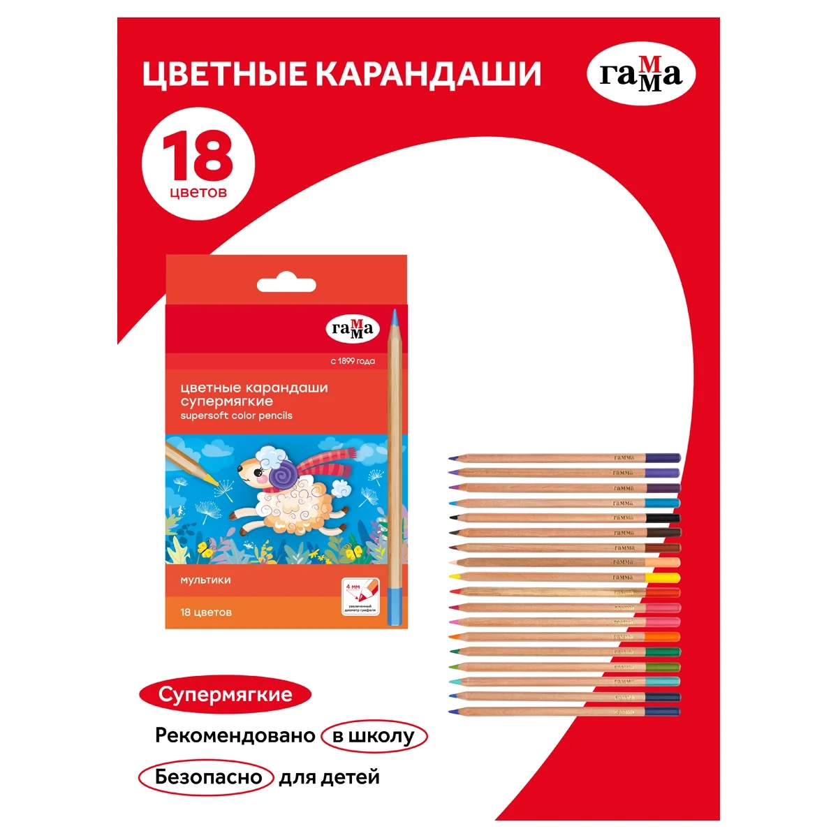 Карандаши цветные Гамма 'Мультики', 18цв., супермягкие, увелич. диаметр грифеля 4,0мм, заточен., кар