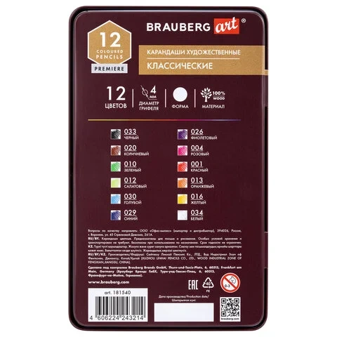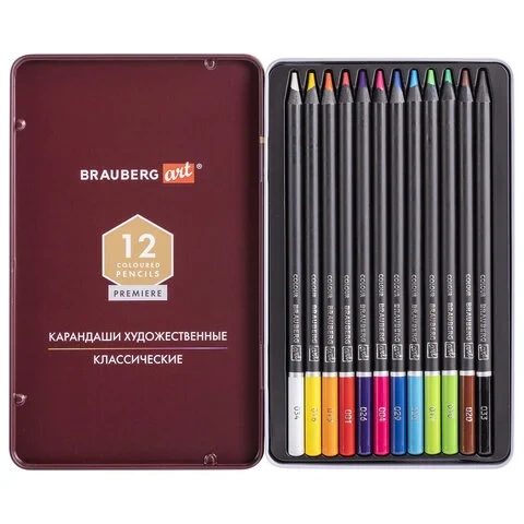 Карандаши художественные цветные BRAUBERG ART PREMIERE, 12 цветов, МЯГКИЙ грифель 4 мм, металл, 1815