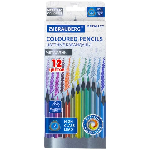 Карандаши цветные BRAUBERG METALLIC, 12 цветов металлик, черное дерево, трёхгранные, 181853