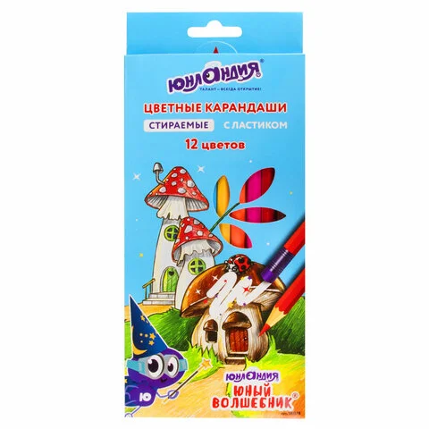 Карандаши цветные стираемые с ластиком ЮНЛАНДИЯ 'ЮНЫЙ ВОЛШЕБНИК', 12 цветов, 181578