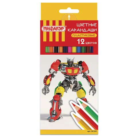 Карандаши цветные ПИФАГОР 'БОЕВОЙ РОБОТ', 12 цветов, пластиковые, классические заточенные, 181341