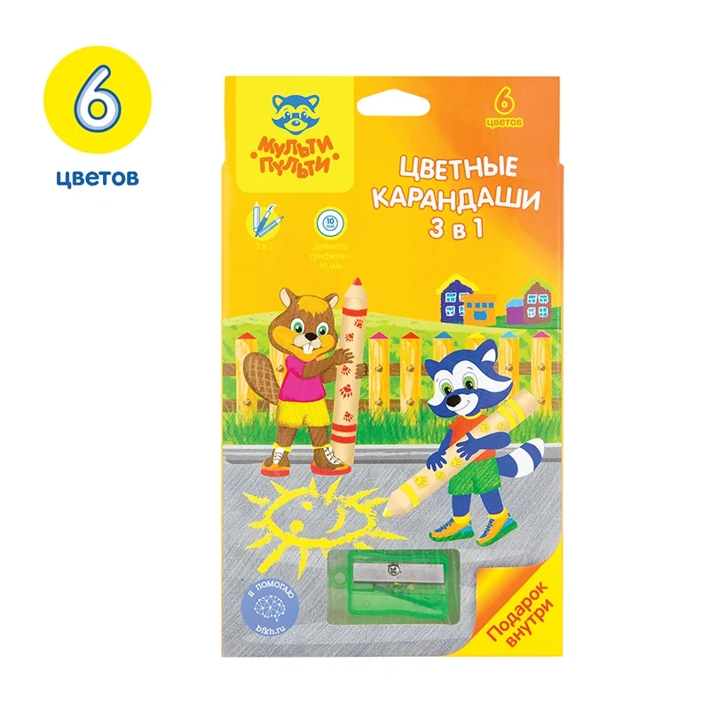Карандаши цветные Мульти-Пульти 'Енот на лугу', 06цв., утолщ., трехгран., укорочен., заточен., карто