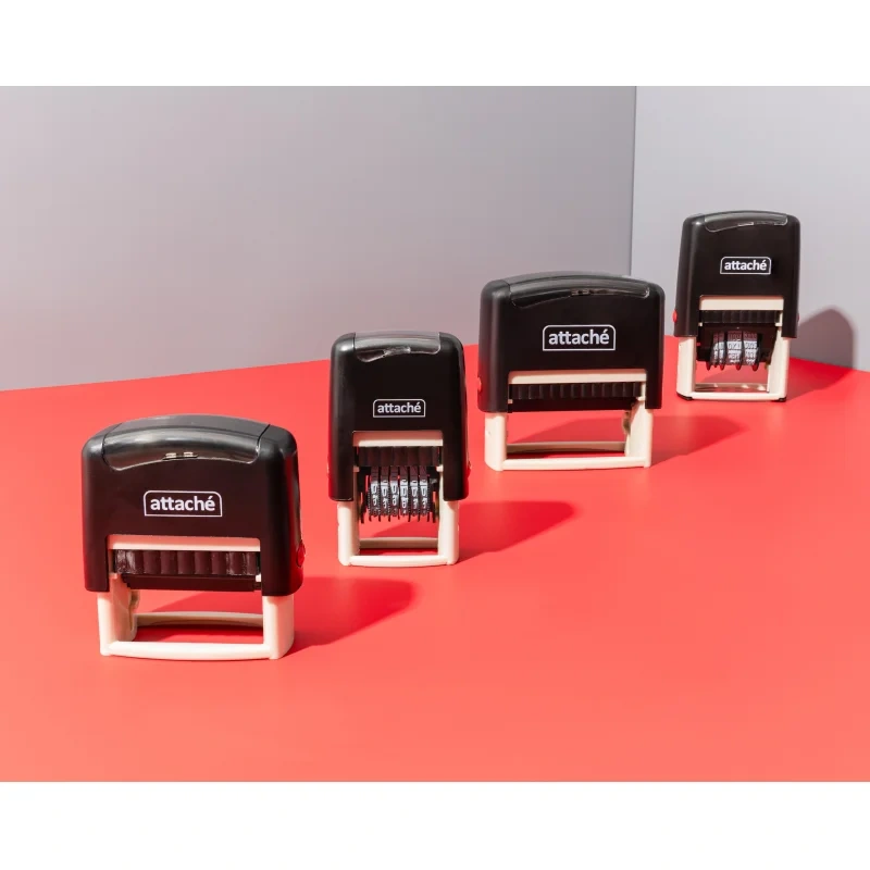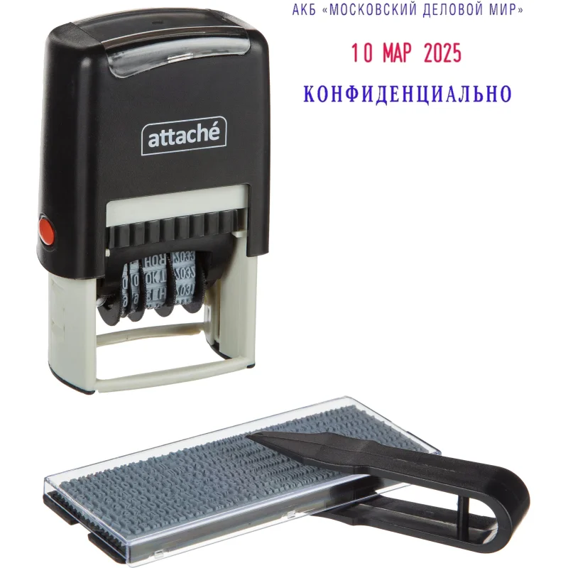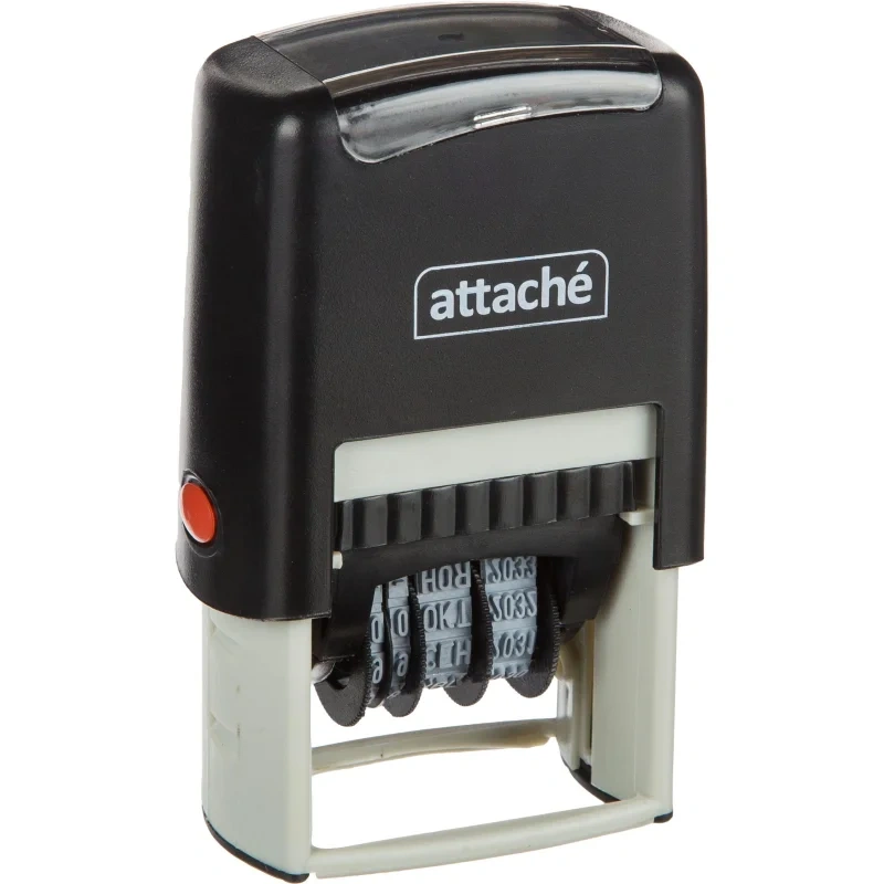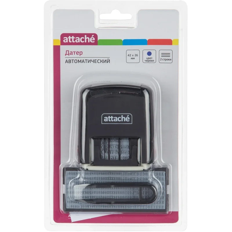 Датер автоматический самонабный Attache 2 строки 42х26мм 8755 Датер автоматический самонаборный Attache предназначен для самостоятельного создания и изменения текста оттиска. Материал корпуса: пластик. Максимальное количество строк: 2. Размер шрифта: 4 мм. Легкая и чистая замена штемпельной подушки. Размер оттиска: 42x26 мм. Свободное поле: нет.