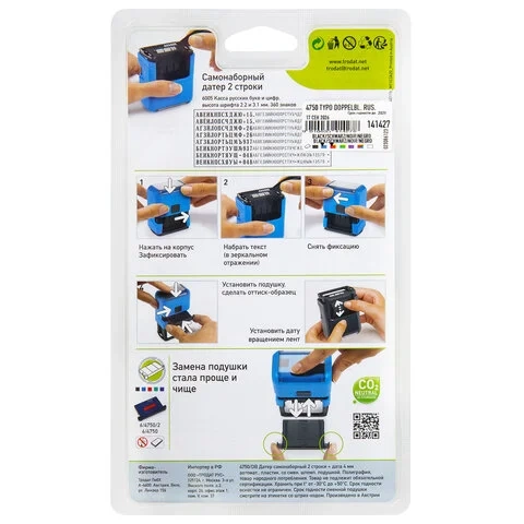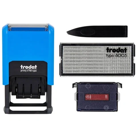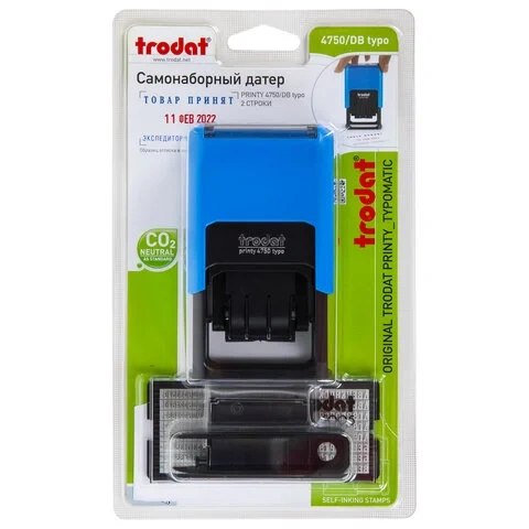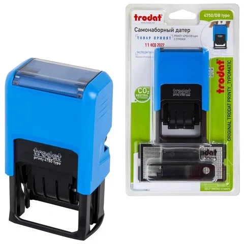 Датер самонаборный Trodat 4750/DB с автоматической оснасткой позволяет самостоятельно создавать и изменять информацию на тестовом поле, расположенную вокруг даты. В комплект входят датер с рифленой пластиной на 2 строки, автоматическая оснастка, пинцет, касса букв русского алфавита и цифр из высококачественной резины на 330 символов, сменная двухцветная подушечка. Высота шрифта даты - 4 мм. Максимальное количество знаков в строке основного шрифта – 24, строки выделения – 16. Размер поля 41х24 мм.