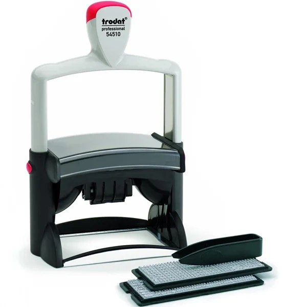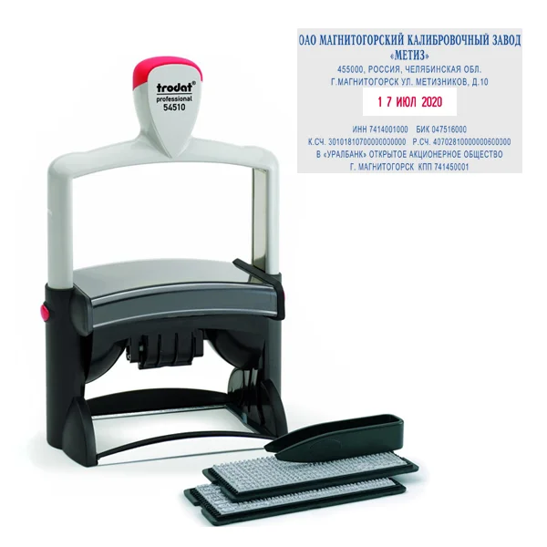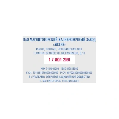 Если требуется дату выделить, то можно воспользоваться сменной подушкой с двойной окраской. В этом случае оттиск реквизитов компании в свободном поле будет проставлен синим цветом, а дата - красным.