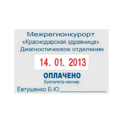 Если требуется дату выделить, то можно воспользоваться сменной подушкой с двойной окраской. В этом случае оттиск реквизитов компании в свободном поле будет проставлен синим цветом, а дата - красным.