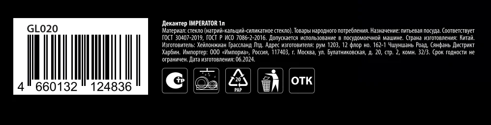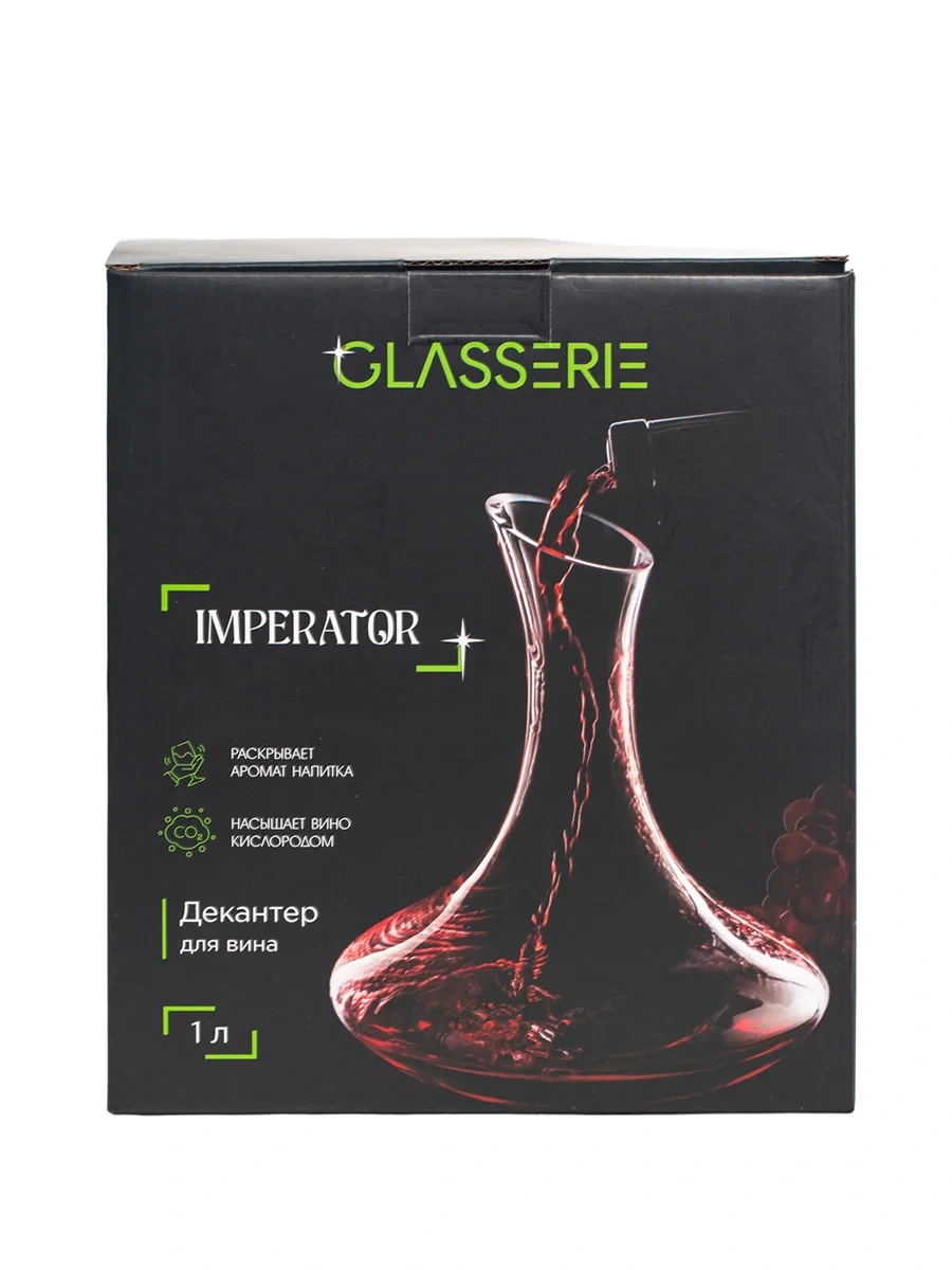 Декантер Glasserie Imperator, 1 л представляет собой прозрачный график, предназначен для декантации и красивой подачи вина. В нем сочетаются эстетичность и функциональность, что делает его незаменимым на любой кухне. Благодаря элегантному дизайну изделие способно украсить любой праздничный стол. В такой емкости можно подавать не только вино, но и ликер, морс и другие напитки. Декантер изготовлен из легкого, но прочного высококачественного стекла. Он очень удобен как для переливания вина из бутылки и его подачи. Вкус напитка в нем становится более ярким, так как он активно насыщается кислородом. Благодаря гладкой поверхности изделие моется быстро и легко.