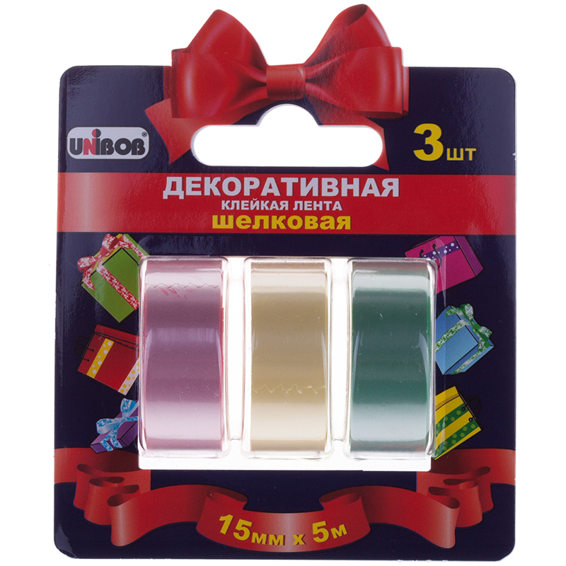 Декоративная клейкая лента Unibob 15мм х 5м, ассорти, 3 шт/уп