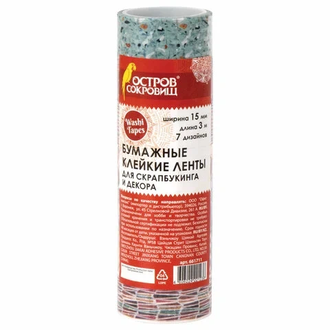 Клейкие WASHI-ленты для декора 'Микс №1', 15 мм х 3 м, 7 цветов, рисовая бумага, ОСТРОВ СОКРОВИЩ, 66