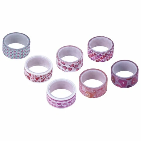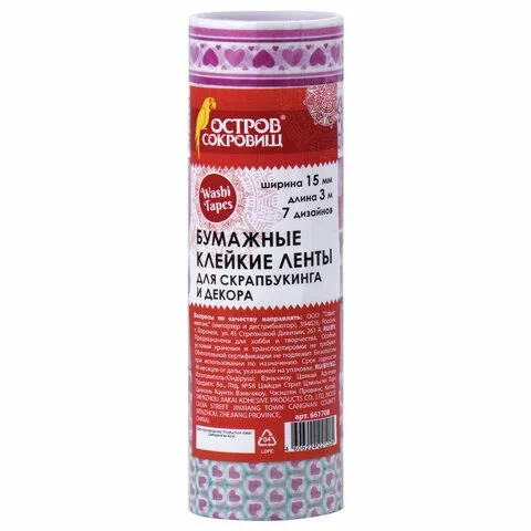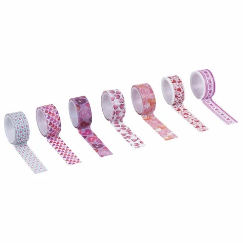 Клейкие WASHI-ленты для декора 'СЕРДЦА', 15 мм х 3 м, 7 цветов, рисовая бумага, ОСТРОВ СОКРОВИЩ, 661