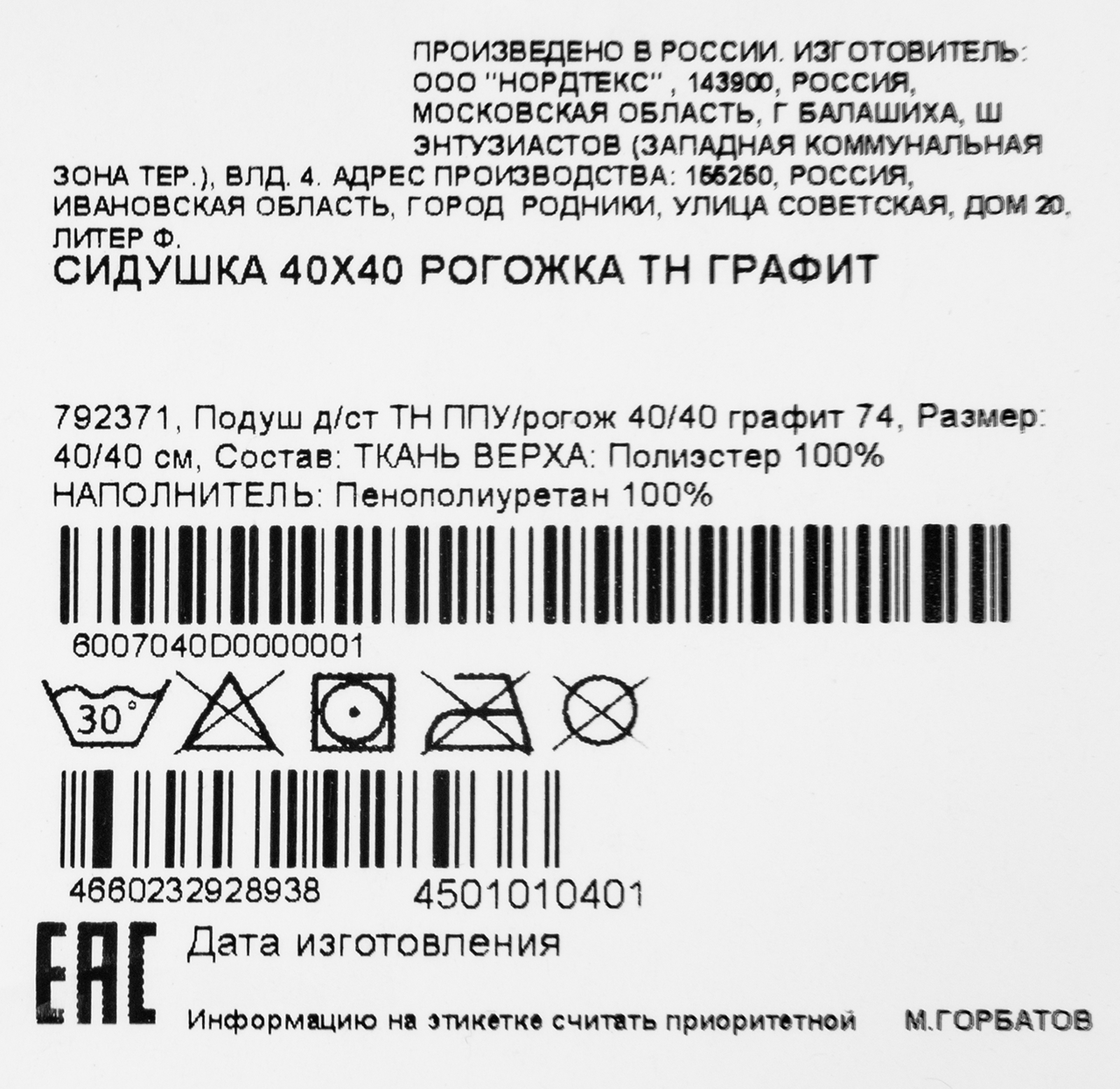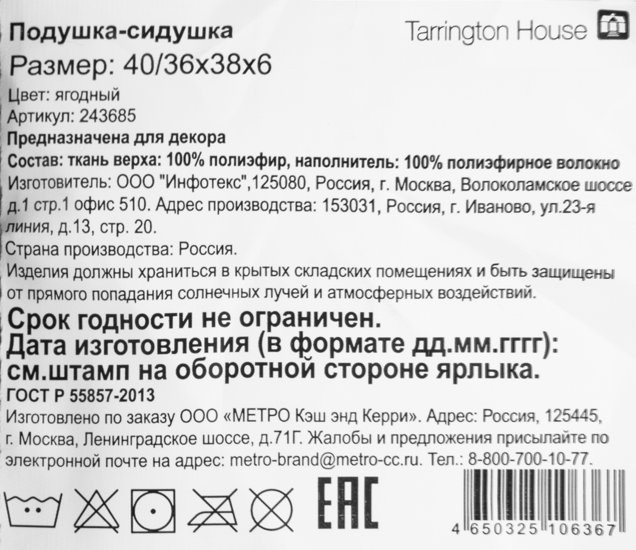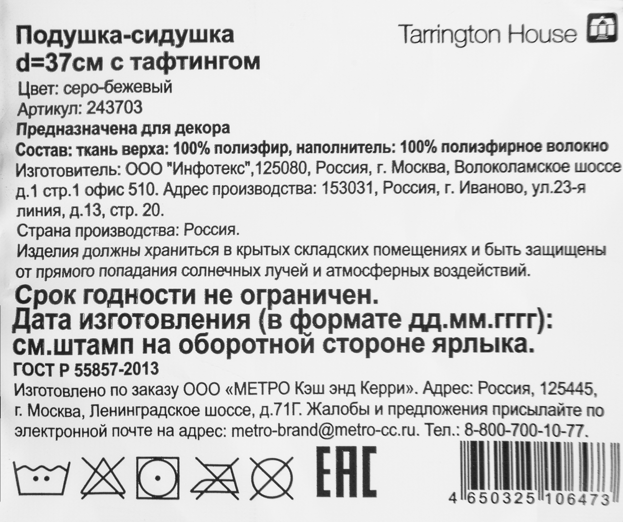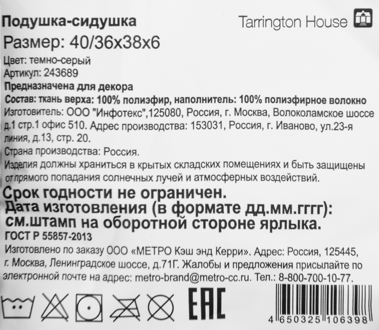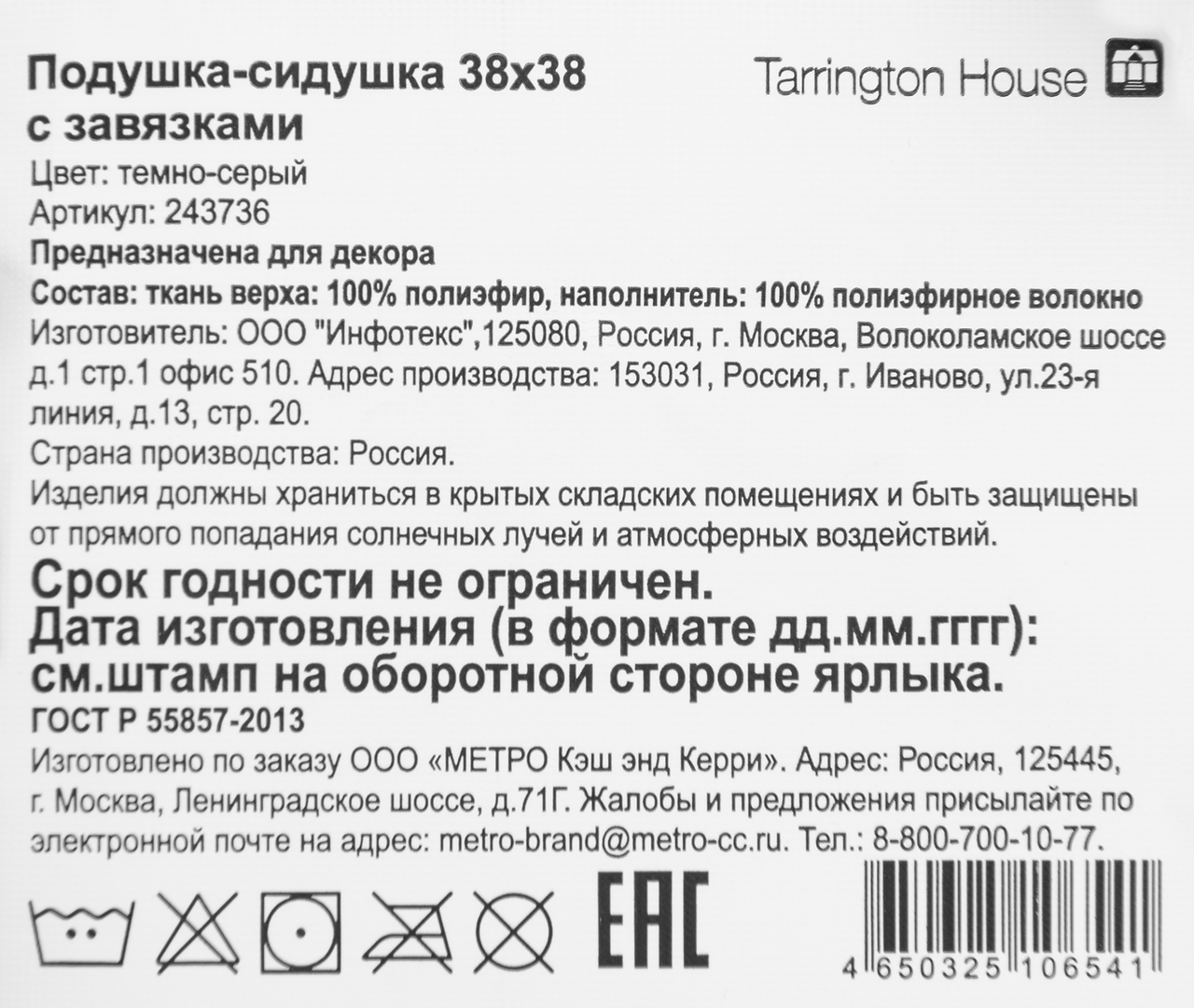 Tarrington House Сидушка рогожка графит, 40 x 40см