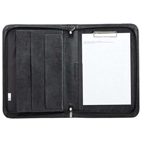 Распашная деловая папка на молнии. Состоит из двух больших карманов для документов. Снабжена металлическим прижимом для бумаг. Дополнительные отделения для визиток и пр.
