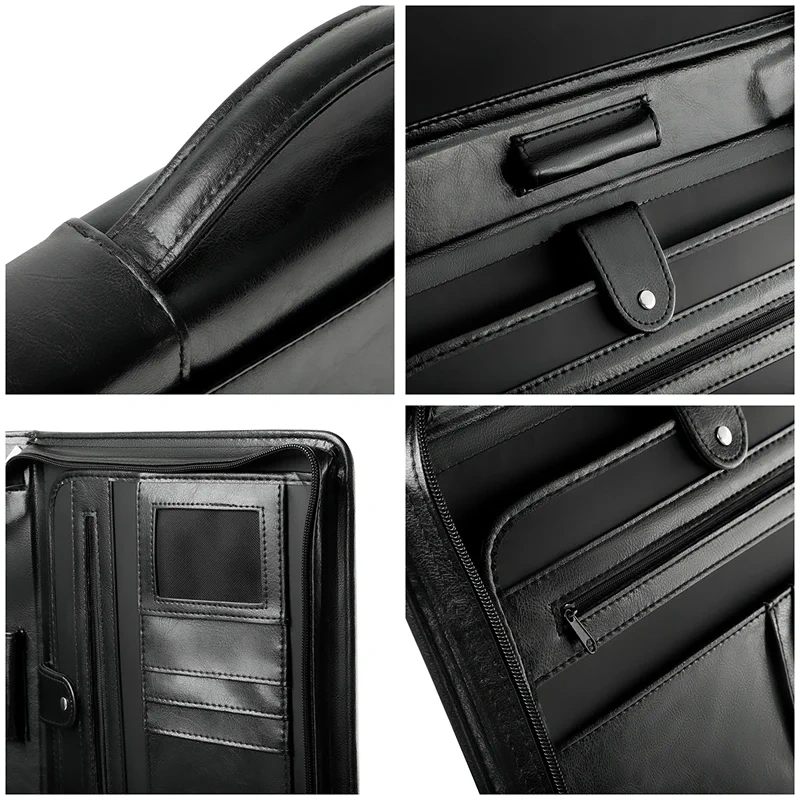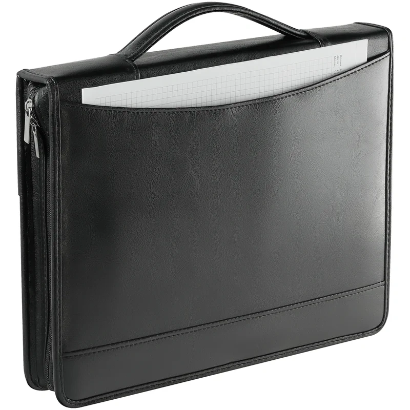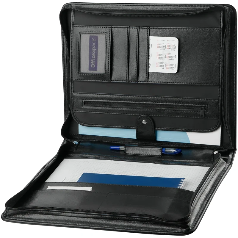 Деловая папка для документов формата А4 из искусственной кожи OfficeSpace. Размер: 360*285*30 мм. Папка имеет одну ручку для переноски, внешние карманы на обеих сторонах, застёжку-молнию. Внутри карман с клапаном на кнопке, крепления для ручек, отделения для визиток.