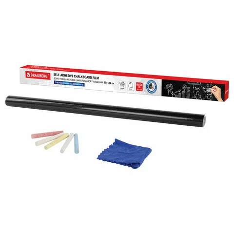 Доска-пленка меловая самоклеящаяся в рулоне, черная, 60х120 см, 5 мелков и салфетка, BRAUBERG, 23783