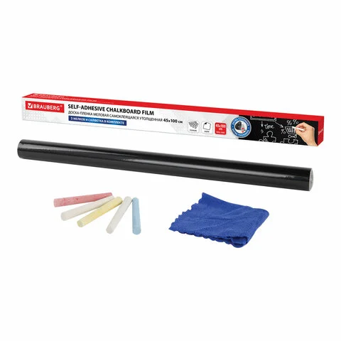 Доска-пленка меловая самоклеящаяся в рулоне, черная, 45х100 см, 5 мелков и салфетка, BRAUBERG, 23783