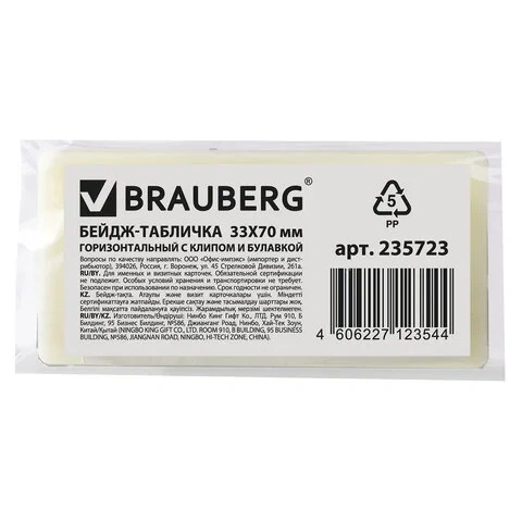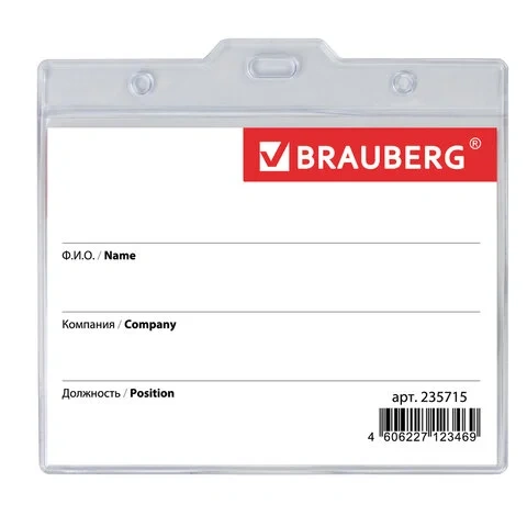 Бейдж с клипом и булавкой Brauberg 33х70мм