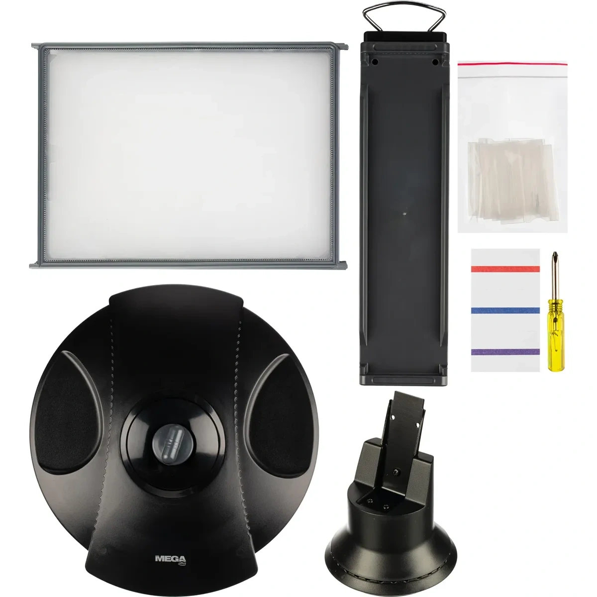 Система оснащена вращающимся механизмом, что делает её удобной для коллективного использования и позволяет легко поворачивать панели. Конструкция установлена на устойчивое основание размером 34.5×32×9 см, предотвращающее опрокидывание при эксплуатации. Общие габариты системы составляют 55×47 см.