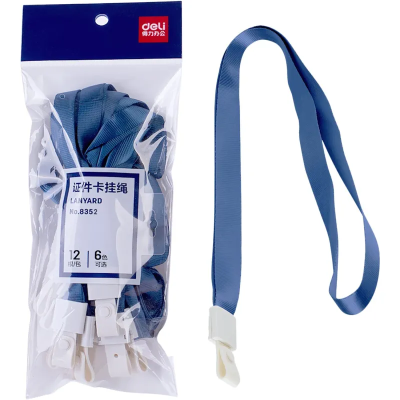 Держатель для бейджа Deli с замком на кнопке. Изготовлен из полиэстера. Цвет: голубой. Ширина тесьмы — 10 мм, длина — 45 см. Поставляется в упаковке по 12 штук.