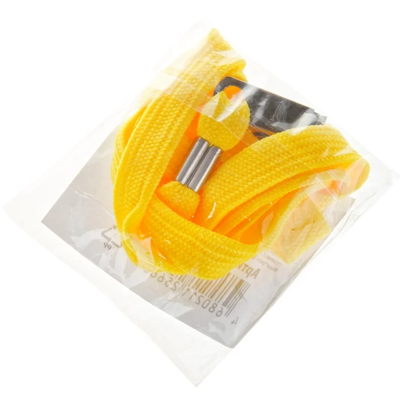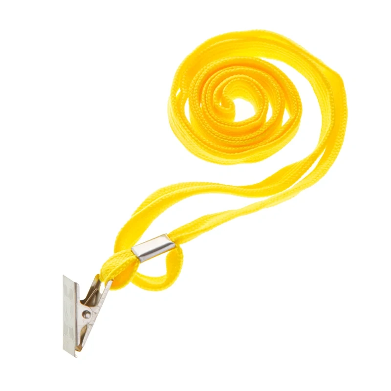 Съемный текстильный шнурок крепится к бейджу с помощью металлической клипсы. Цвет шнурка - желтый.