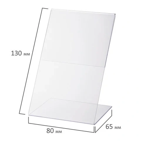 Изготовлена из прозрачного акрилового стекла толщиной 1 мм. Имеет размер 130х80 мм. Максимальная толщина вставки составляет 1,5 мм, глубина основания держателя информации - 65 мм, ширина ножки - 1 мм. 20 штук в комплекте.