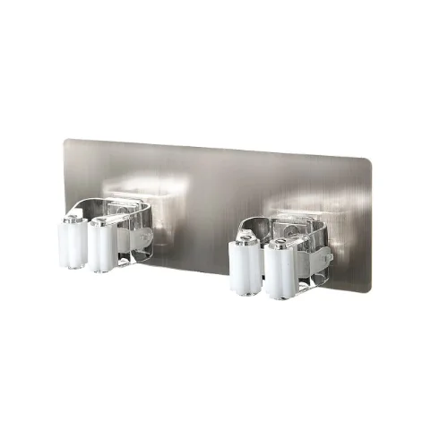 Двойной держатель предназначен для удобного и компактного хранения домашнего уборочного инвентаря; легко и прочно фиксирует инвентарь разного диаметра (до 35 мм); удобно крепить держатель к поверхности на прочный клеевой слой; выдерживают нагрузку до 5 кг; не повреждает поверхность инвентаря; серебристая основа в стиле Hi-Teck.