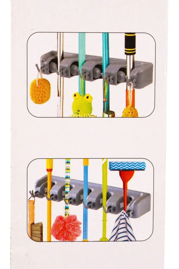 Настенный держатель для инвентаря подходит для швабр, щеток, салфеток, хозяйственного инвентаря.Имеет 5 пластиковых зажимов для рукояток и 6 крючков.Предназначен для систематизации уборки, обеспечивает удобное и компактное настенное хранение благодаря чему позволяет разместить много вещей.