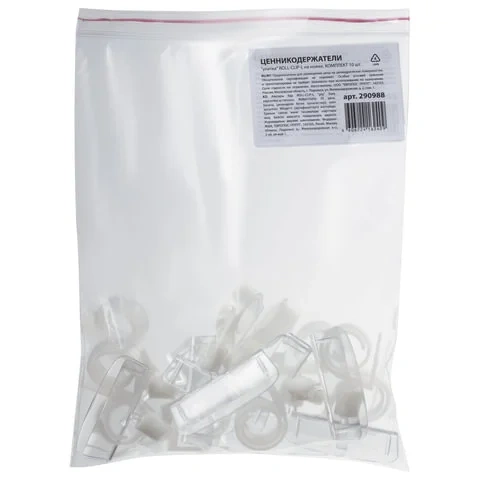 Универсальный держатель ценника 'улитка', позволяющий крепить ценник на посуду, продукты, край полки разной толщины. Угол наклона ценника регулируется с помощью шарниров. Характеристики Крепление - 'улитка'. Максимальная толщина карточки - 0,7 мм. Материал - пластик. Комплект - 10 шт. Вес: 0.0840 кг. Объем: 0.0005 м3. Артикул производителя: 112071. Штрих-код: 4606224162409. Производитель: Россия.