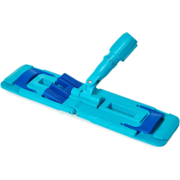 Держатель предназначен для швабры-флаундера (плоской), с размером 40×10 см. Он совместим с несколькими типами крепления насадок МОПа, такими как зажим, карман/ухо, липучка и тип «уши» с карманами. Держатель выполнен из пластика и окрашен в бирюзовый цвет. Диаметр резьбы составляет 22 мм, что обеспечивает хорошее закрепление насадки и удобство при работе.