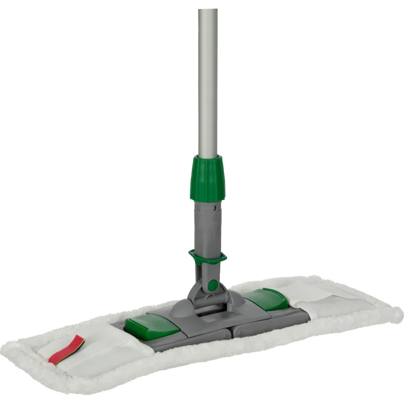 Оснащен шарнирным соединением, обеспечивающим хороший контакт мопа с поверхностью и свободу движений, что позволяет проводить уборку в труднодоступных местах: под витринами, стеллажами, полками, шкафами и прочей мебелью.