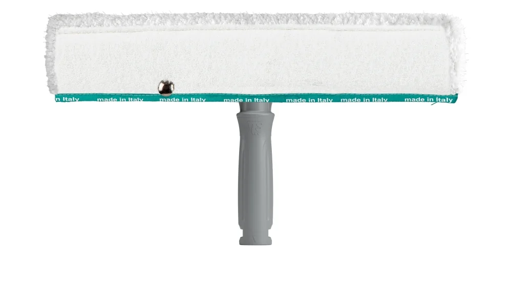 Фиксированная поддержка из полипропилена с системой крепления Lampo и полиэстеровым рукавом для мытья окон со щетинками для чистки и абразивной подушкой. Обеспечивает высокую производительность при удалении грязи. В комплект входит система очистки стекла с флисом и скребком. Идеально подходит для традиционного использования.