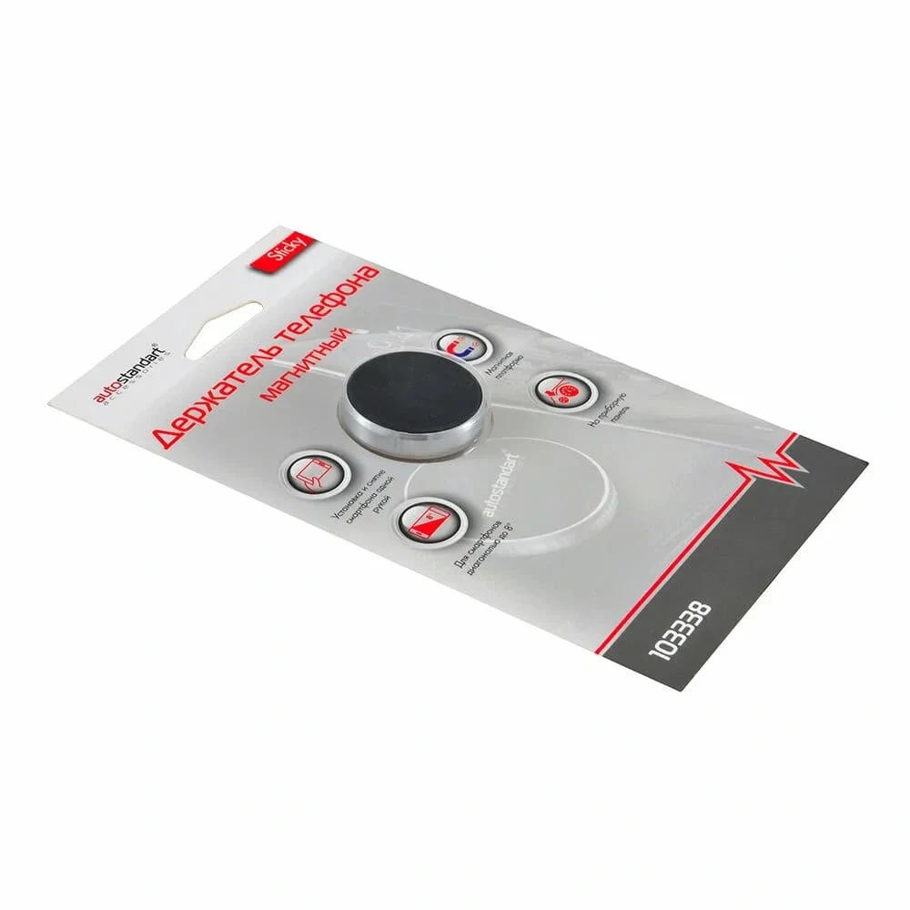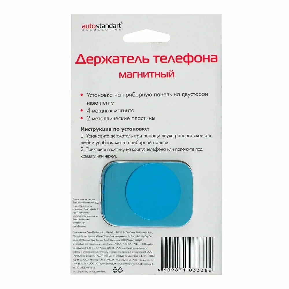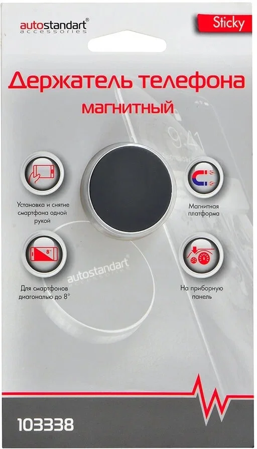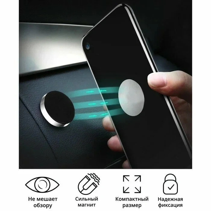 Устанавливается в любом удобном месте на приборной панели при помощи двухстороннего скотча. Платформа снабжена четырьмя магнитами. Диаметр платформы 45 мм. Компактный, легкий, портативный. В наборе две металлические пластины.