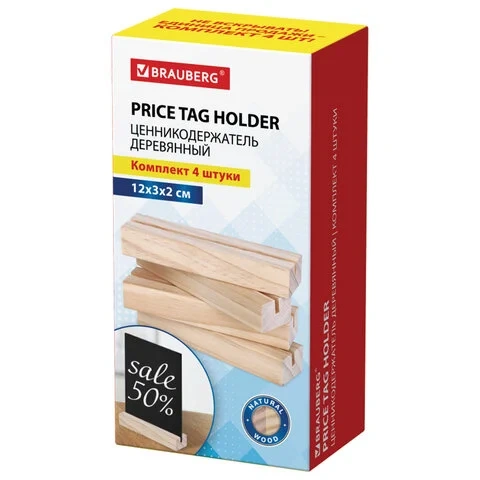 Ценникодержатель деревянный (ценники, реклама, фото) 12х3х2 см, КОМПЛЕКТ 4 шт., BRAUBERG, 291314