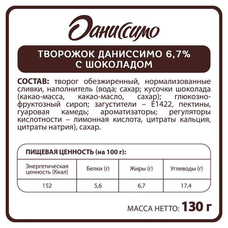 Десерт творожный Даниссимо с шоколадной крошкой, 130 г – это сочетание нежнейшего творога с кусочками настоящего шоколада. Нежный насыщенный вкус, манящий ароматом и воздушная консистенция – устоять невозможно. Даниссимо является прекрасным дополнением к завтраку. Вы можете взять его с собой на работу или учебу. Он не только наполнит энергией, но и подарит прекрасное настроение на весь день. Герметичная упаковка защищает продукт от влаги и посторонних запахов.