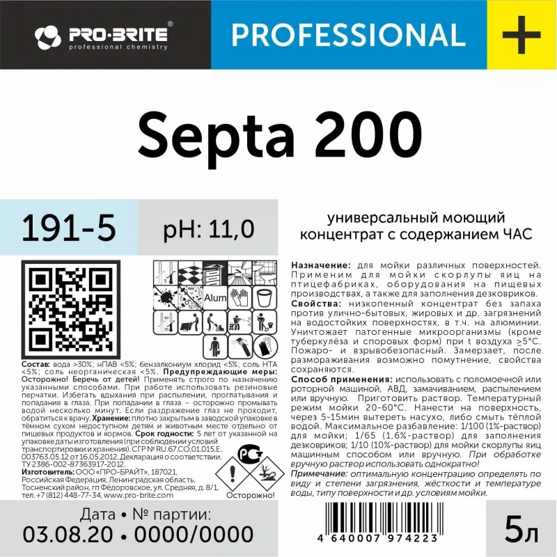 Дезинфицирующий концентрат Pro-Brite Septa 200 5л, 191-5