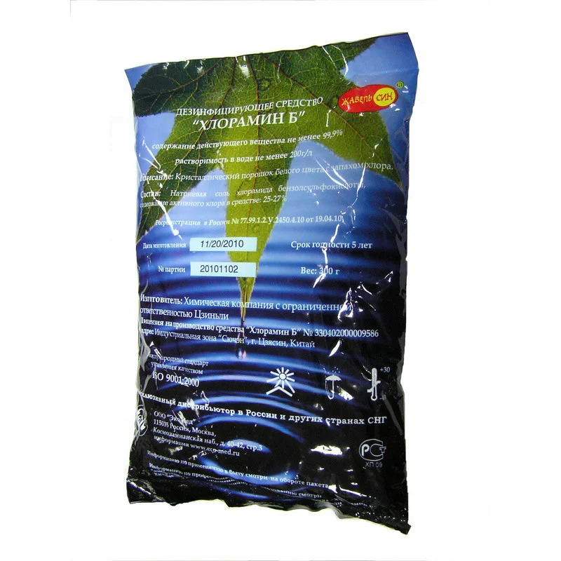 Состав: содержит натриевую соль хлорамида бензолсульфокислоты (не менее 98%). Содержание активного хлора в средстве не менее 25%.