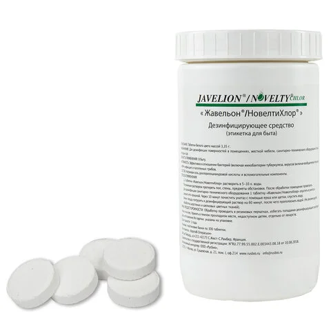 Консистенция, свойства дезинфицирующего средства «Жавельон/Новелти Хлор»: быстрорастворимые таблетки белого цвета весом 3,35 г, при растворении 1 таблетки в воде выделяется 1,5 г активного хлора. Водные растворы прозрачны, имеют легкий запах хлора.