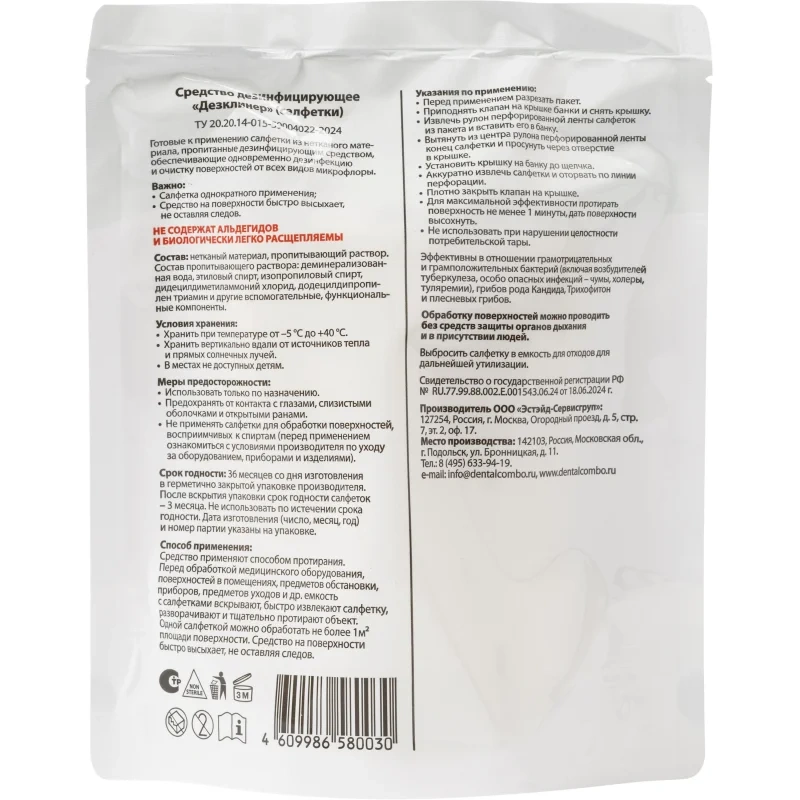 Дезинфицирующие салфетки представляют собой сменный блок в мягкой упаковке. Перфорированный рулон из белого плотного нетканого материала, пропитанный дезинфицирующим раствором. Салфетки являются одноразовыми. Безопасны для применения в медицинских учреждениях. Не содержит альдегидов и фенолов. Размер салфеток - 13х17 см. Экспозиция 3-5 минут. Состав дезинфицирующего раствора: вода очищенная, изопропанол, этанол, дидецилдиметиламмониум хлорид, додецил дипропилен триамин, ЧАС. Назначение: для дезинфекции поверхности медицинских приборов и оборудования (в том числе поверхности аппаратов искусственного дыхания и оборудования для анестезии, стоматологические наконечники, зеркала), оптических приборов и оборудования, разрешенных производителем к обработке спиртовыми средствами, датчиков диагностического оборудования (УЗИ и т.п.), поверхностей жесткой мебели. Область применения: ветеринария, фитнес-центры, оздоровительные комплексы, бани, сауны, санатории, дома отдыха, стоматология, косметология. Эффективны в отношении Гр+ и Гр- бактерий (включая ВБИ, микобактерии туберкулеза, кишечных инфекций), вирусов (острые респираторные вирусные инфекции, герпес, полиомиелит, гепатиты всех видов, включая гепатиты А, В и С, ВИЧ-инфекция, аденовирус), грибов рода Кандида, Трихофитон. Салфетки обладают хорошими моющими свойствами. Проводить обработку поверхностей можно без средств защиты органов дыхания и в присутствии людей. Срок годности: 2 года.