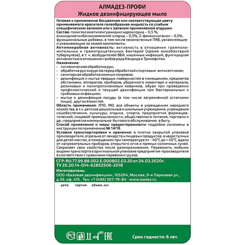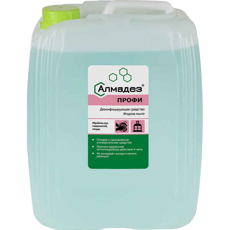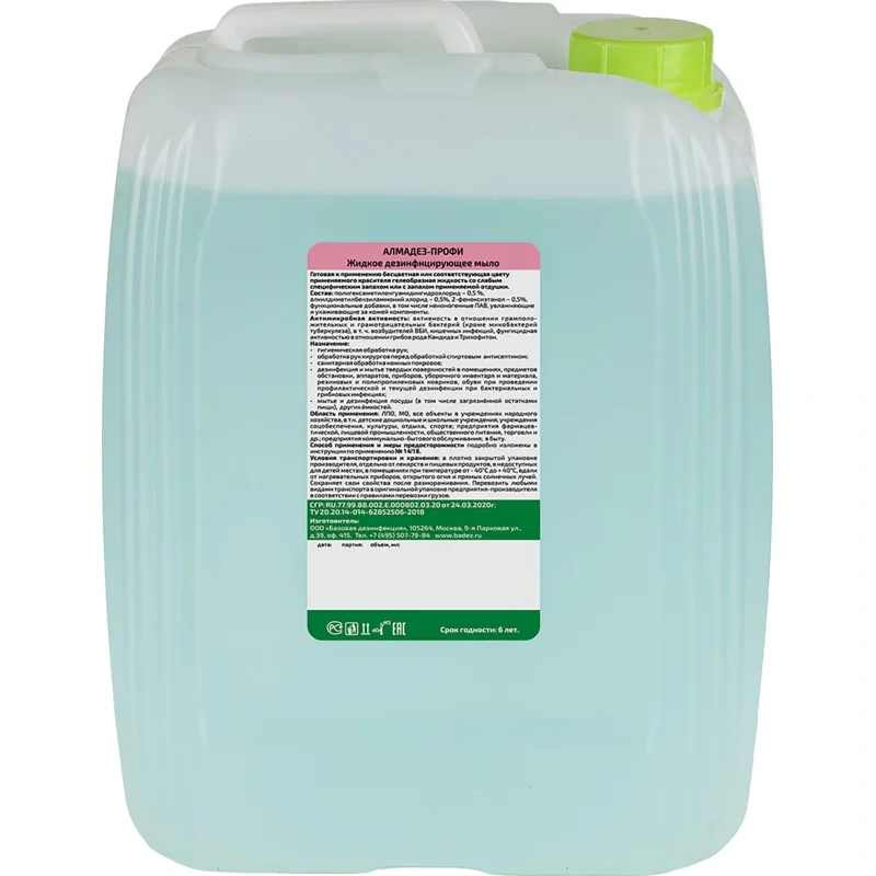 Дезинфицирующее средство (жидкое мыло) «Алмадез-профи» представляет собой готовую к применению бесцветную или соответствующую цвету применяемого красителя гелеобразную жидкость со слабым специфическим запахом или с запахом применяемой отдушки.