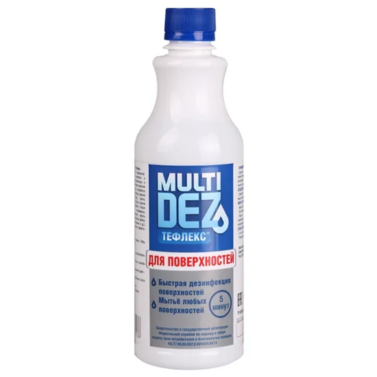 Мультидез-Тефлекс - для мытья и дезинфекции поверхности обладает антимикробной активностью в отношении бактерий (включая туберкулез), вирусов (гриппа, в т.ч. птичьего, свиного и т.д. полиомиелита, энтеровирусы, гепатиты, ВИЧ-инфекция, атипичная пневмония), грибов (рода Кандида, Трихофитон, плесневые грибы).