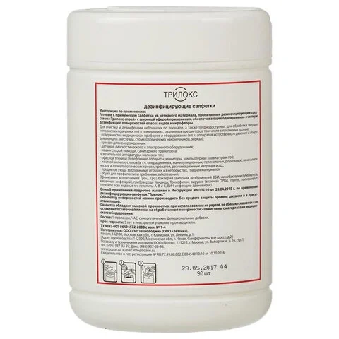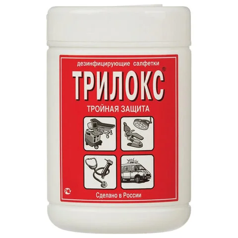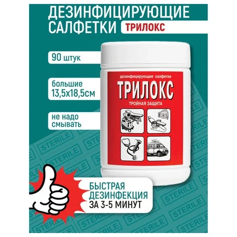 Готовые к применению влажные дезинфицирующие салфетки из белого нетканого материала, равномерно пропитанные дезинфицирующим раствором ТРИЛОКС с минимальным эффективным содержанием спирта для быстрой дезинфекции небольших по площади поверхностей и оборудования.