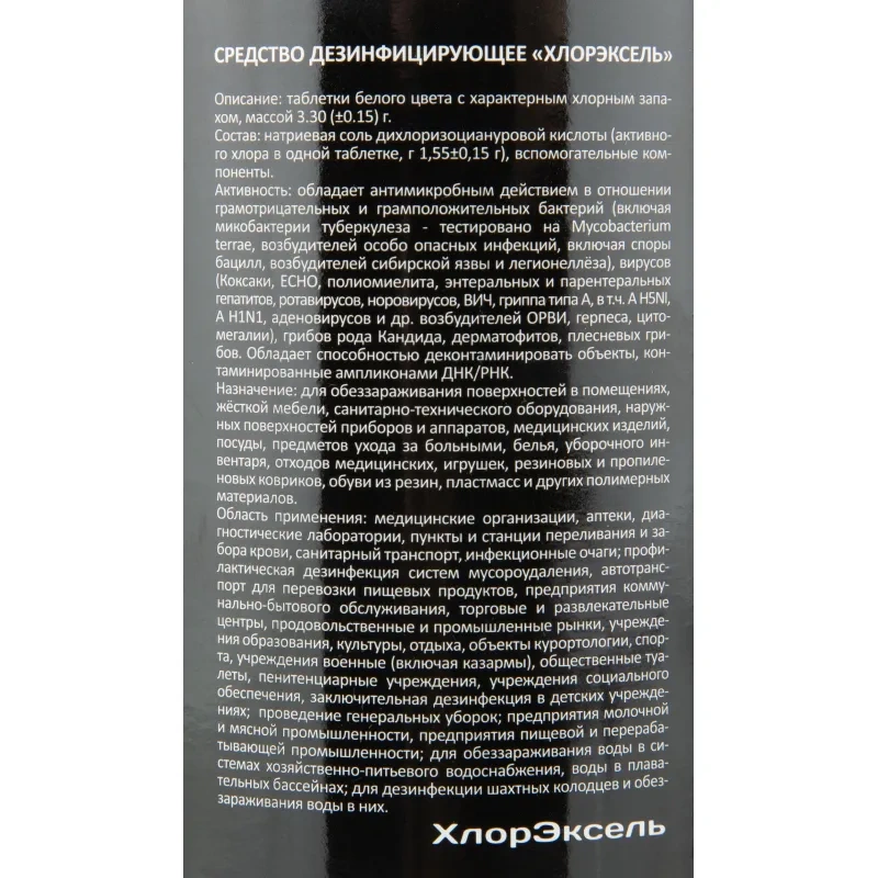 Состав: натриевая соль дихлоризоциануровой кислоты (Nа-соль ДХИЦК) не менее 84%, вспомогательные компоненты, бикарбонат натрия, адипиновая кислота. Активного хлора в одной единице — 1,55 ±0,15г, (47±3%). Масса 1 таблетки: 3,3 ±0,15г Значение pH 1%-раствора: 7 (±0,5)