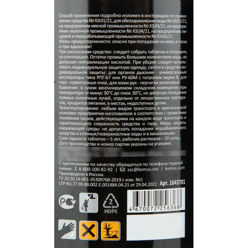 Способ применения: дезинфекцию проводят рабочими растворами средства способами протирания, орошения, погружения, замачивания. Используется в виде водного раствора в концентрации от 0,015% до 3% по активному хлору в зависимости от способа применения и степени загрязнения поверхности. Растворы готовят в стеклянных или пластмассовых ёмкостях путём растворения соответствующего количества таблеток в водопроводной воде комнатной температуры до полного их растворения. Более подробные рекомендации по приготовлению рабочих растворов изложены в инструкциях по применению средства &8470; ХЭ.02/21 — на предприятиях мясной промышленности &8470; ХЭ.03/21 — на предприятиях молочной промышленности &8470; ХЭ.04/21 — на предприятиях пищевой и перерабатывающей промышленности &8470; ХЭ.05/21, &8470; ХЭ.01/21 — для обеззараживания воды.