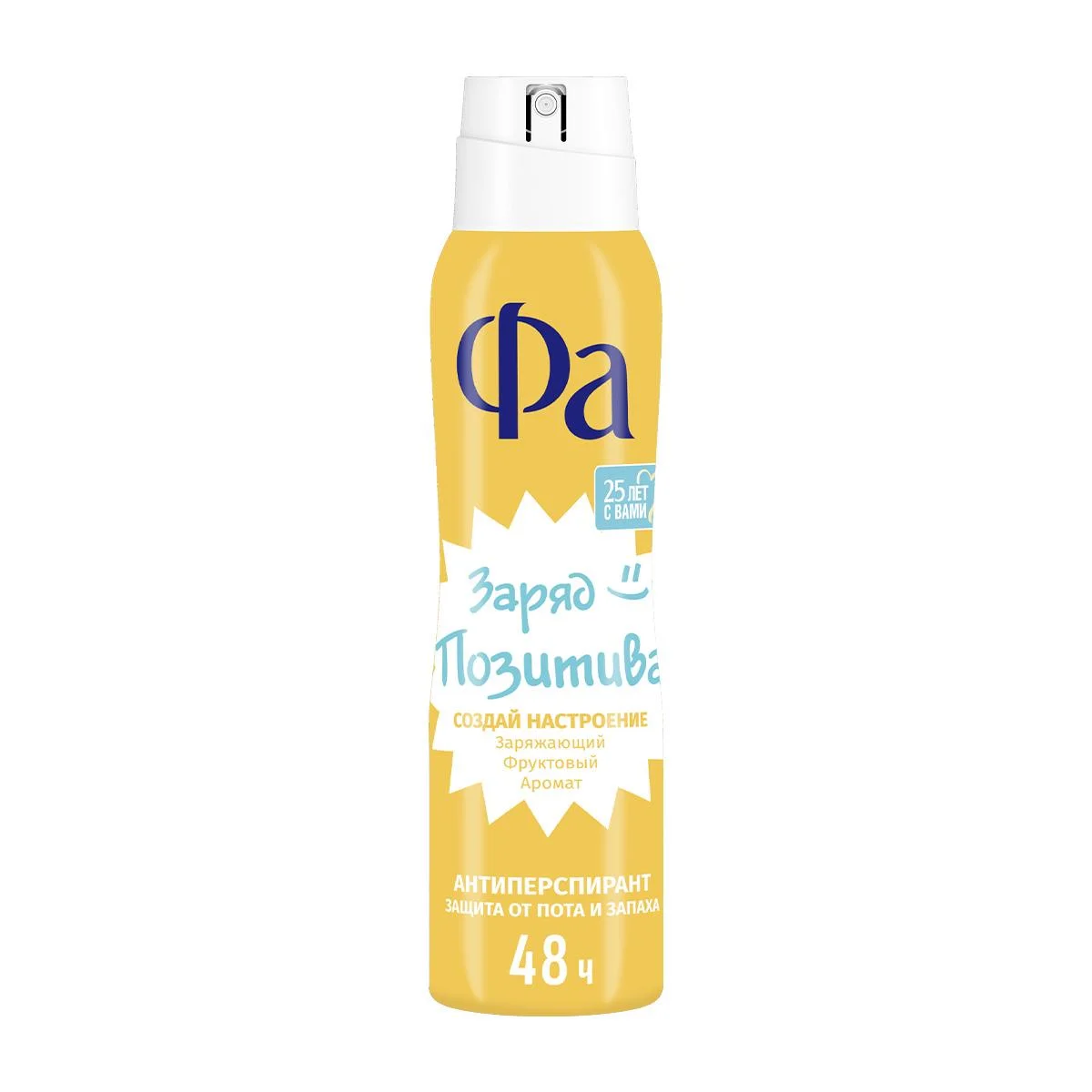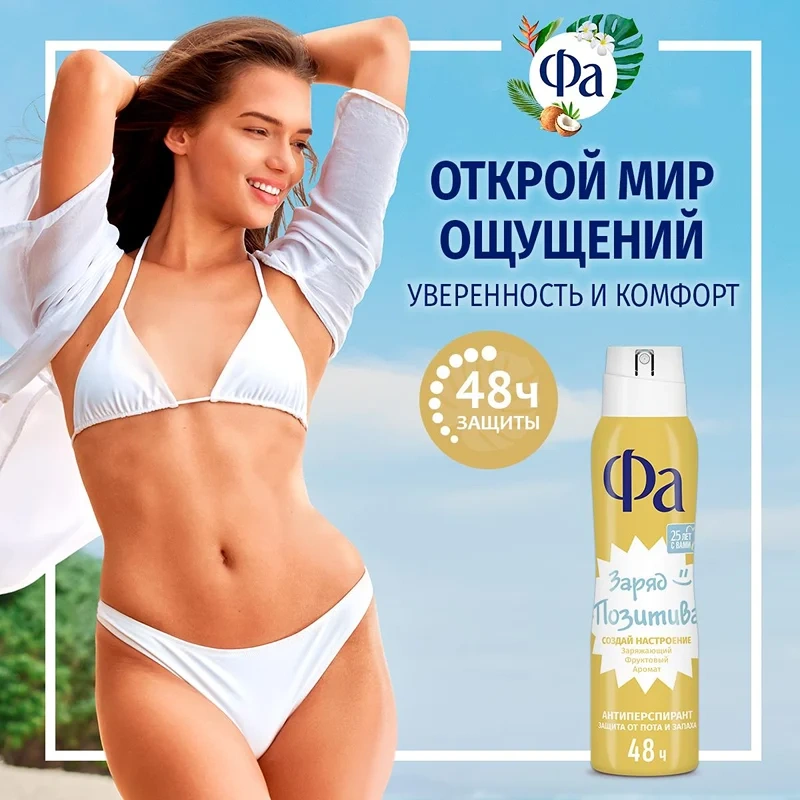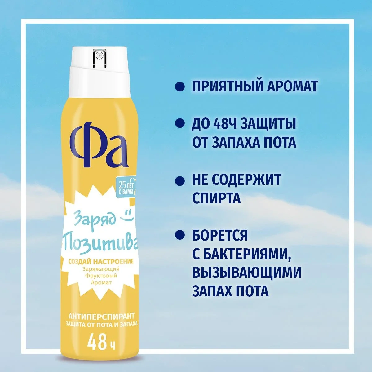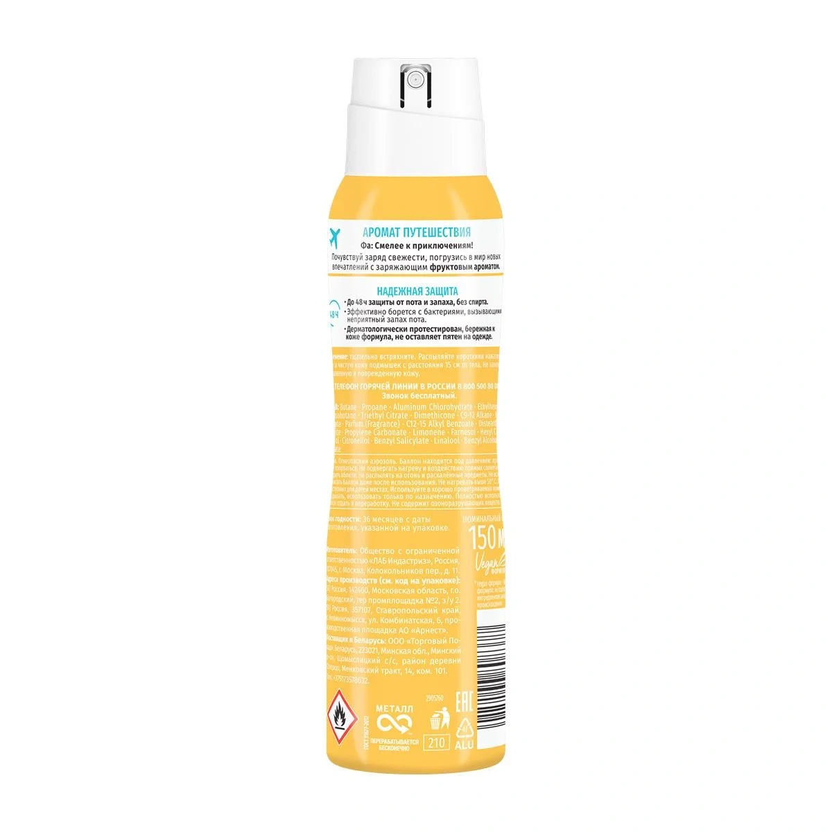 Фа: Смелее к приключениям! Почувствуй заряд свежести, погрузись в мир новых впечатлений с заряжающим фруктовым ароматом. Аэрозоль женский дезодорант-антиперспирант. До 48 ч защиты от пота и запаха, без спирта. Формула с технологией раскрытия аромата обеспечивает ощущение длительной свежести и активирует аромат, когда это особенно необходимо. Дерматологически протестирован, бережная к коже формула, не оставляет пятен на одежде. Веган формула: не содержит ингредиентов животного происхождения.