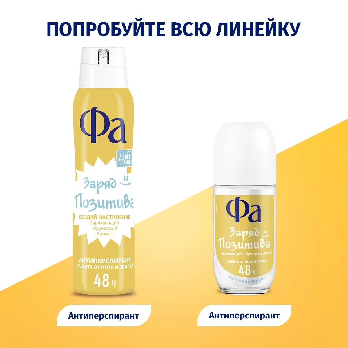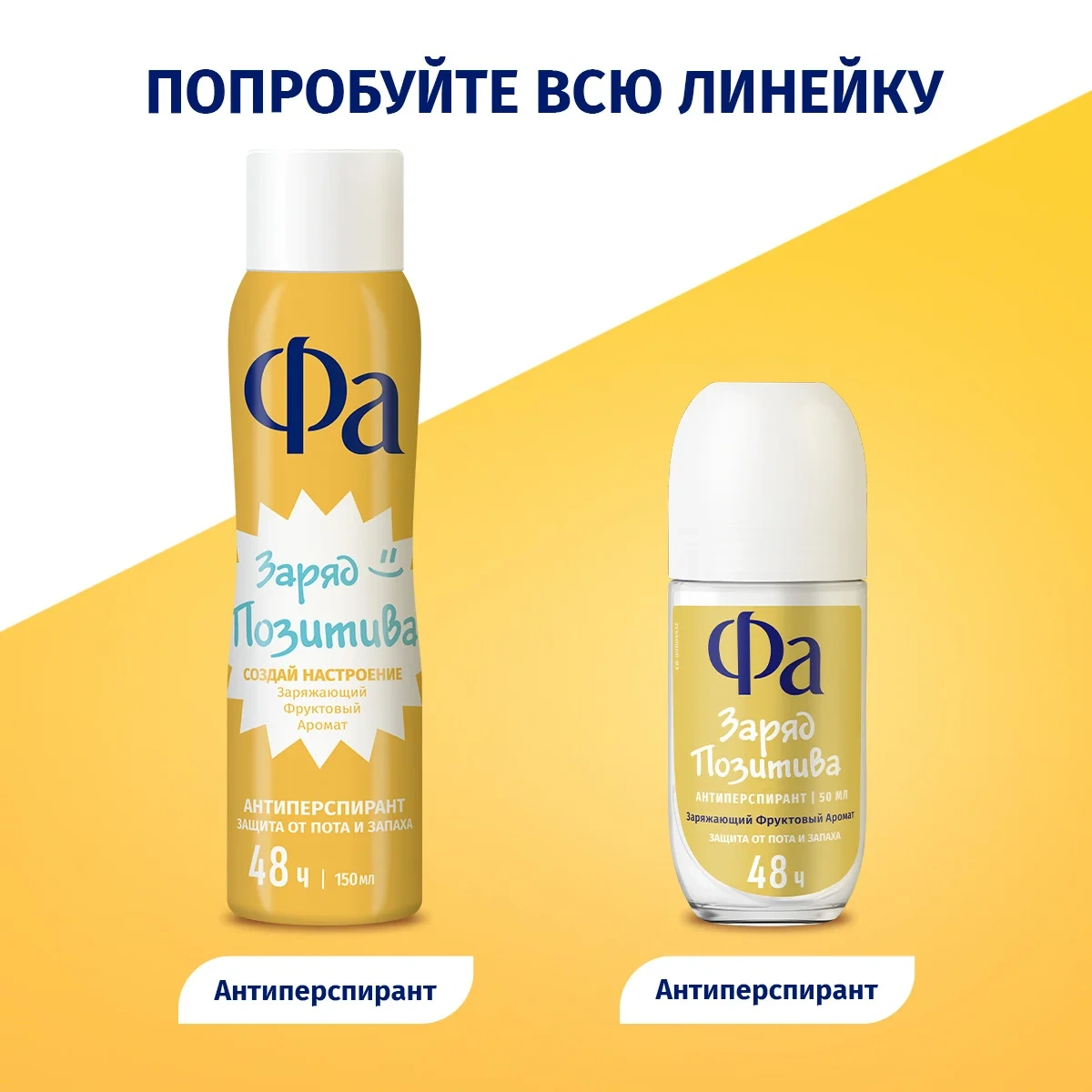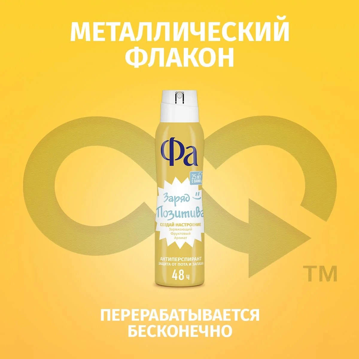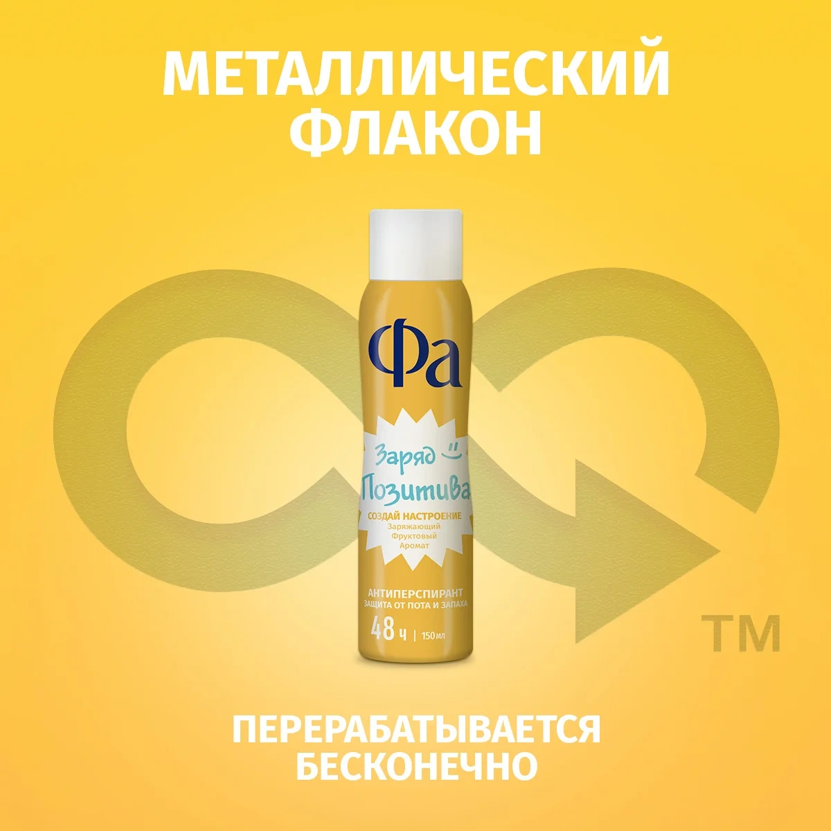 Фа: Смелее к приключениям! Почувствуй заряд свежести, погрузись в мир новых впечатлений с заряжающим фруктовым ароматом. Аэрозоль женский дезодорант-антиперспирант. До 48 ч защиты от пота и запаха, без спирта. Формула с технологией раскрытия аромата обеспечивает ощущение длительной свежести и активирует аромат, когда это особенно необходимо. Дерматологически протестирован, бережная к коже формула, не оставляет пятен на одежде. Веган формула: не содержит ингредиентов животного происхождения.