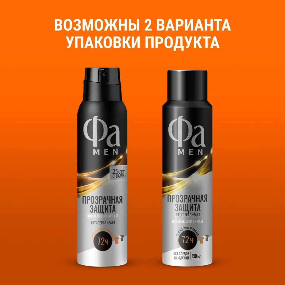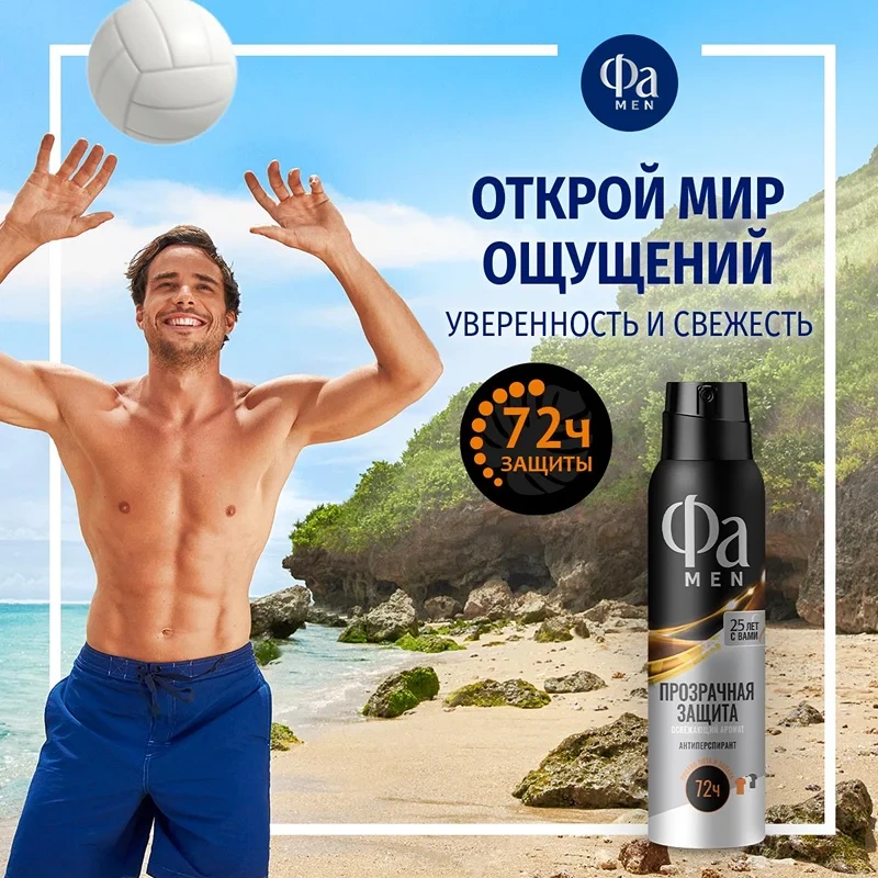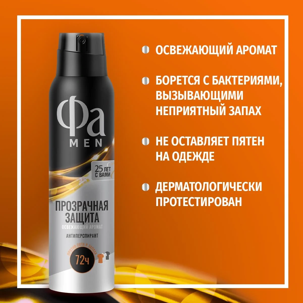 Фа: Смелее к приключениям! Почувствуй заряд свежести, ощути уверенность во время активного дня с освежающим ароматом. Мужской аэрозоль дезодорант-антиперспирант. До 72 часов защиты от пота и влажных подмышек без спирта. Обеспечивает длительную свежесть и защиту против белых следов и желтых, масляных пятен на одежде. Дерматологически протестирован, бережная к коже формула. Веган формула: не содержит ингредиентов животного происхождения.