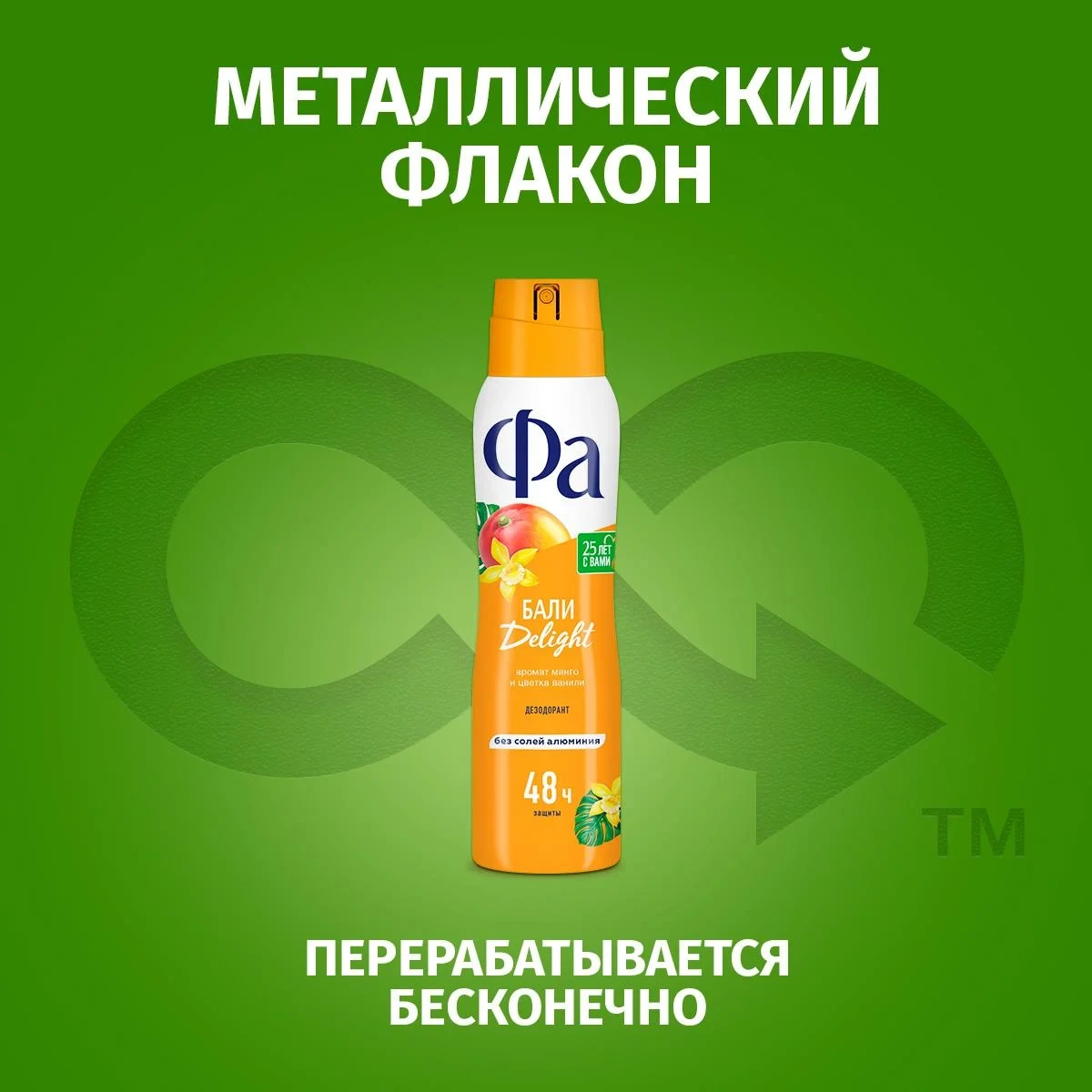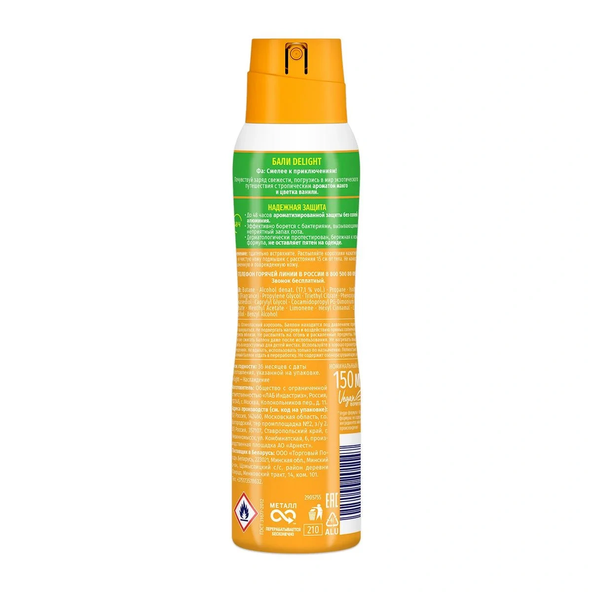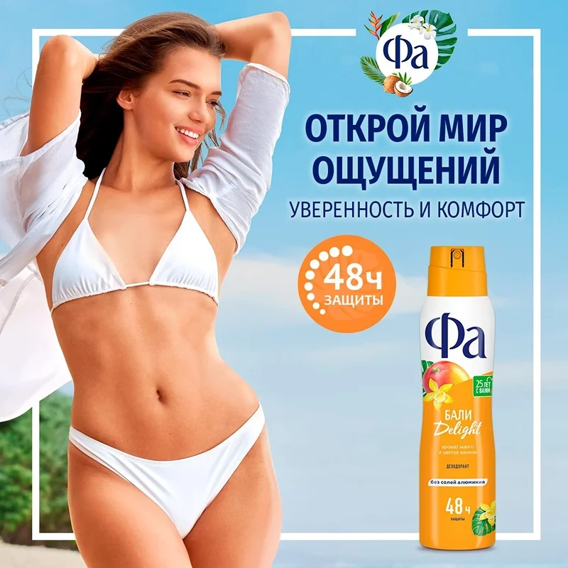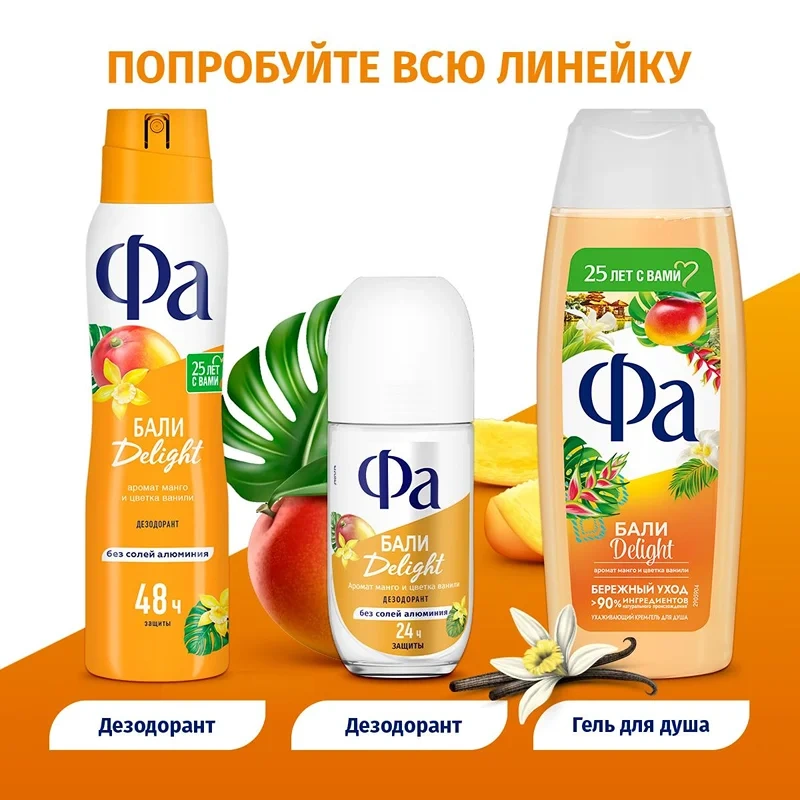 Фа: Смелее к приключениям! Почувствуй заряд свежести, погрузись в мир экзотического путешествия с тропическим ароматом манго и цветка ванили. Женский аэрозоль дезодорант. До 48 часов део-защиты без солей алюминия. Эффективно борется с бактериями, вызывающими неприятный запах пота. Дерматологически протестирован, бережная к коже формула, с технологией против пятен. Веган формула: не содержит ингредиентов животного происхождения.
