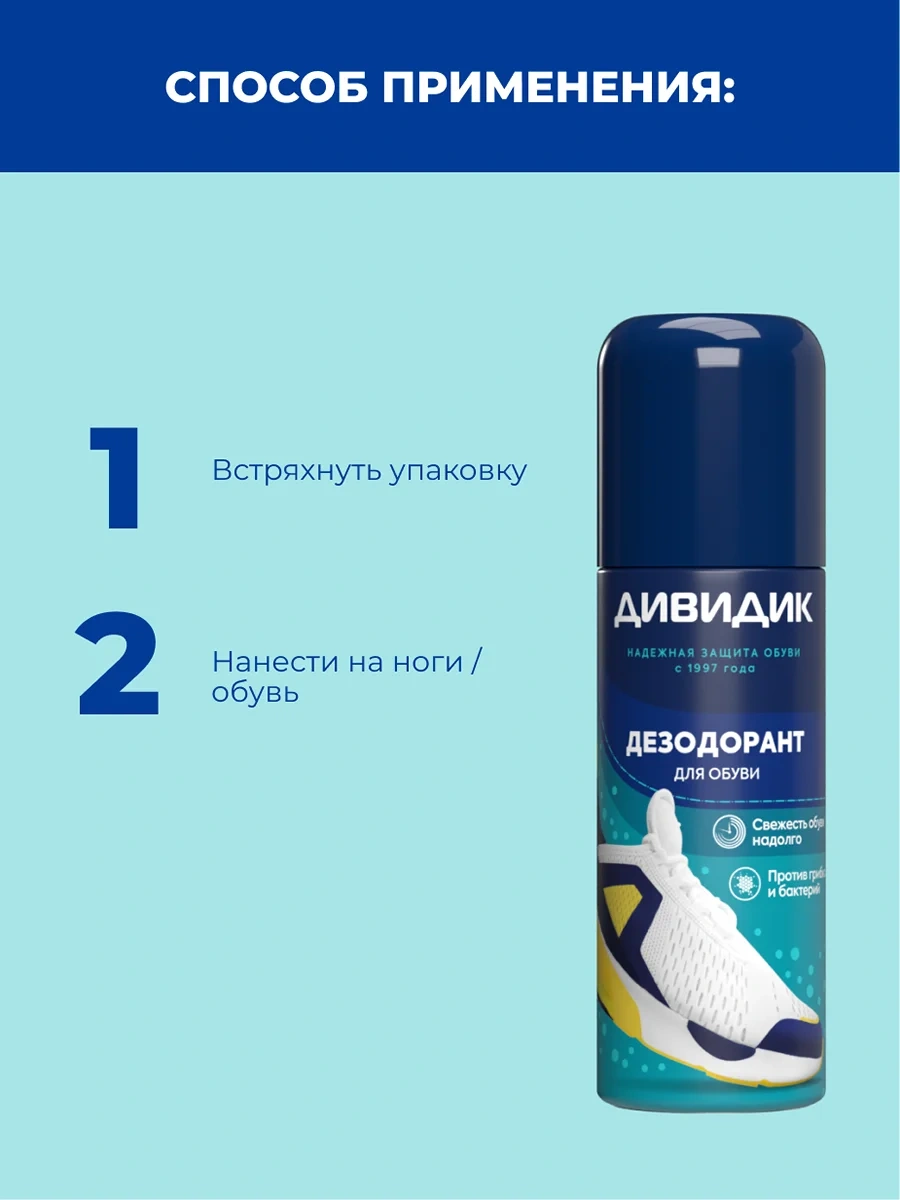 Нейтрализатор запаха Дивидик активно борется с грибком и бактериями, являющимися основной причиной появления неприятных запахов. Его формула содержит антибактериальные компоненты, которые уничтожают вредоносные микроорганизмы и предотвращают их повторное образование. Спрей в формате аэрозоля легко распыляется и подходит для любого типа обуви, будь то спортивная, повседневная или рабочая. Благодаря компактному формату его удобно носить с собой для поддержания свежести в любых условиях. Он быстро высыхает, не оставляя следов или пятен, что обеспечивает незаметность после применения.