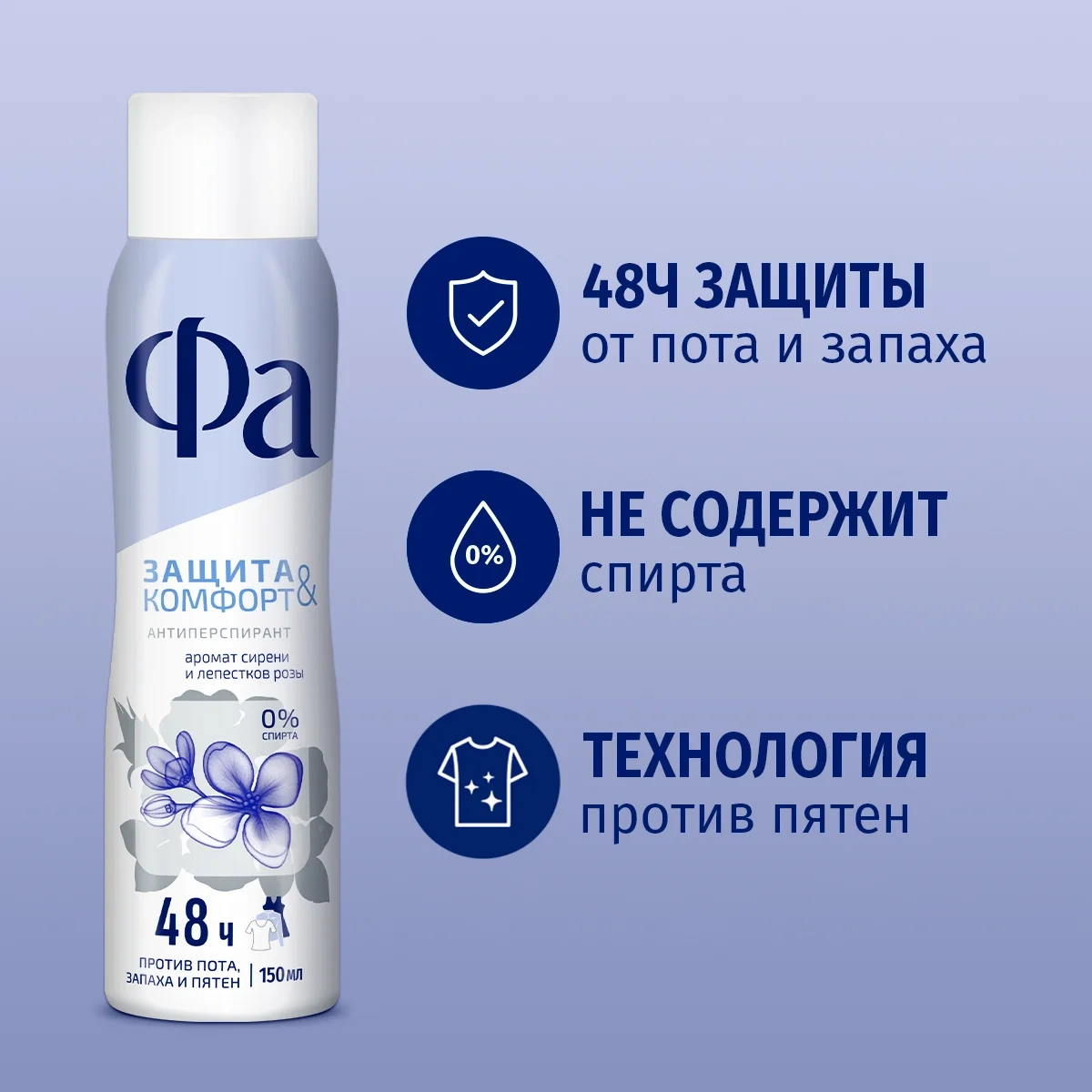 Фа: Смелее к приключениям! Почувствуй заряд свежести, погрузись в мир новых впечатлений с нежным ароматом жасмина. Аэрозоль женский дезодорант-антиперспирант без влажных подмышек и стресса. До 48 часов защиты от пота и влажных подмышек без спирта. Эффективно борется с бактериями, вызывающими неприятный запах пота. Дерматологически протестирован, бережная к коже формула, с технологией против пятен. Веган формула: не содержит ингредиентов животного происхождения. Это легкий, приятный аромат и длительная защита от неприятного запаха. Это средство комплексного действия обеспечивает активную борьбу с бактериями, провоцирующими появление запаха пота, и мягко ухаживает за чувствительной кожей, смягчая и успокаивая ее. Максимальная защита от пота и запаха строится на технологии инкапсуляции, которая активизируется при активном движении, сопровождаемом усиленным потоотделением. Ароматические экстракапсулы моментально раскрываются, обеспечивая приятное ощущение свежести и легкости на протяжении всего дня. Содержит смесь сухих масел, которая деликатно ухаживает за чувствительной кожей, питает и увлажняет ее.