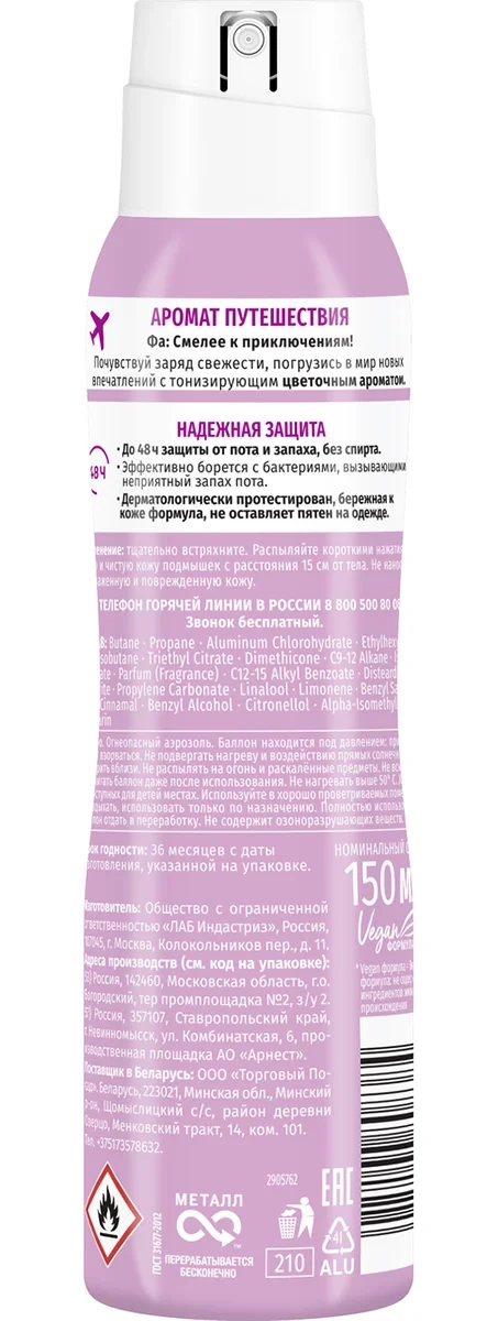 Фа: Смелее к приключениям! Почувствуй заряд свежести, погрузись в мир новых впечатлений с заряжающим фруктовым ароматом. Аэрозоль женский дезодорант-антиперспирант. Формула с технологией раскрытия аромата обеспечивает ощущение длительной свежести и активирует аромат, когда это особенно необходимо. Дерматологически протестирован, бережная к коже формула, не оставляет пятен на одежде. Веган формула: не содержит ингредиентов животного происхождения. это надежная защита тела от пота и неприятного запаха, гарантия свежести кожи и сухости одежды в самых неблагоприятных условиях. Стрессы, физические нагрузки и летняя жара провоцируют повышенное потоотделение. Дезодорант с удобным аэрозольным распылением позволяет на целые 48 часов забыть о проблемах запаха и пятен пота, липкости и раздражении кожи. Средство регулирует работу потовых желез, сохраняя покровы чистыми и здоровыми. Уход предупреждает размножение бактерий на коже. Ароматические компоненты нейтрализуют неприятные запахи и раскрывают свою силу в моменты, когда это более всего необходимо.