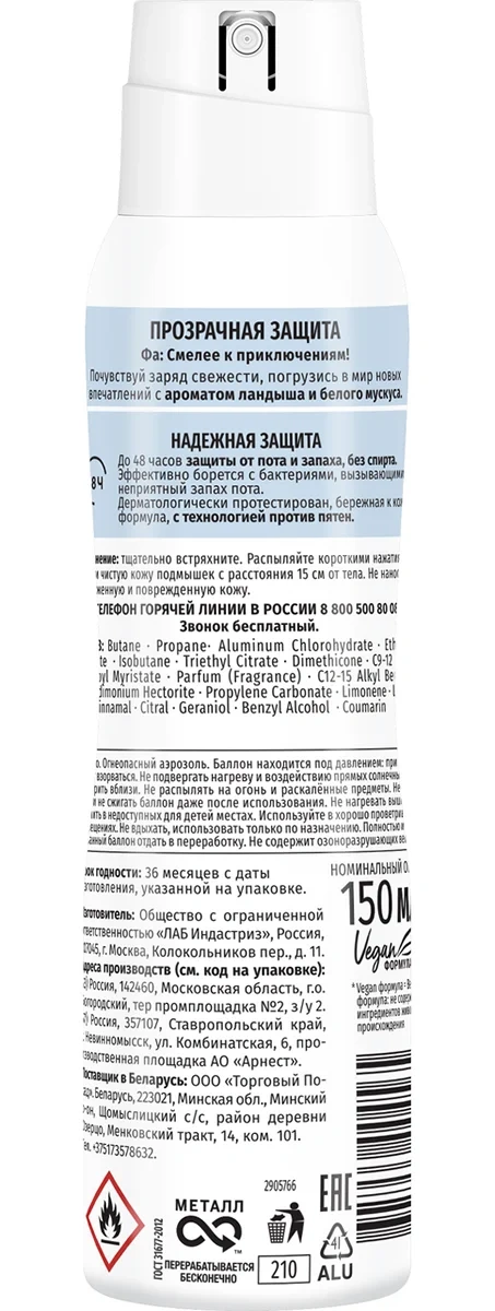Фа: Смелее к приключениям! Почувствуй заряд свежести, погрузись в мир новых впечатлений с нежным цветочным ароматом. Женский аэрозоль дезодорант-антиперспирант без влажных подмышек и стресса. До 48 часов защиты от пота и влажных подмышек без спирта. Эффективно борется с бактериями, вызывающими неприятный запах пота. Дерматологически протестирован, бережная к коже формула, с технологией против пятен. Веган формула: не содержит ингредиентов животного происхождения. Уникальная технология свежесть Non-стоп позволяет чувствовать себя комфортно и не ограничиваться в движении. Спрей не оставляет белых, желтых или масляных пятен на одежде, не вызывает раздражения и зуда. Подходит для всех типов кожи.
